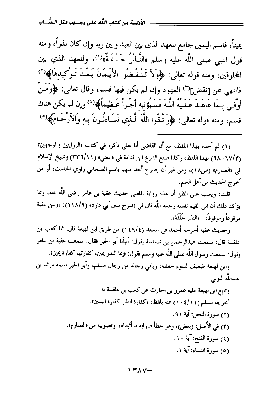 يَمِينًا، فَاسْمُ الْيَمِينِ جَامِعٌ لِلْعَهْدِ الَّذِي بَيْنَ الْعَبْدِ وَبَيْنَ رَبِّهِ وَإِنْ كَانَ نَذْرًا، وَمِنْهُ قَوْلُ النَّبِيِّ صَلَّى اللَّهُ عَلَيْهِ وَسَلَّمَ " النَّذْرُ حَلْفَةٌ " وَلِلْعَهْدِ الَّذِي بَيْنَ الْمَخْلُوقِينَ، وَمِنْهُ قَوْلُهُ تَعَالَى: {وَلَا تَنْقُضُوا الْأَيْمَانَ بَعْدَ تَوْكِيدِهَا} [النحل: 91] فَالنَّهْيُ عَنْ [نَقْضِ] الْعُهُودِ وَإِنْ لَمْ يَكُنْ فِيهَا قَسَمٌ، وَقَالَ تَعَالَى: {وَمَنْ أَوْفَى بِمَا عَاهَدَ عَلَيْهُ اللَّهَ فَسَيُؤْتِيهِ أَجْرًا عَظِيمًا} [الفتح: 10] وَإِنْ لَمْ يَكُنْ هُنَاكَ قَسَمٌ، وَمِنْهُ قَوْلُهُ تَعَالَى: {وَاتَّقُوا اللَّهَ الَّذِي تَسَاءَلُونَ بِهِ وَالْأَرْحَامَ} [النساء: 1]
