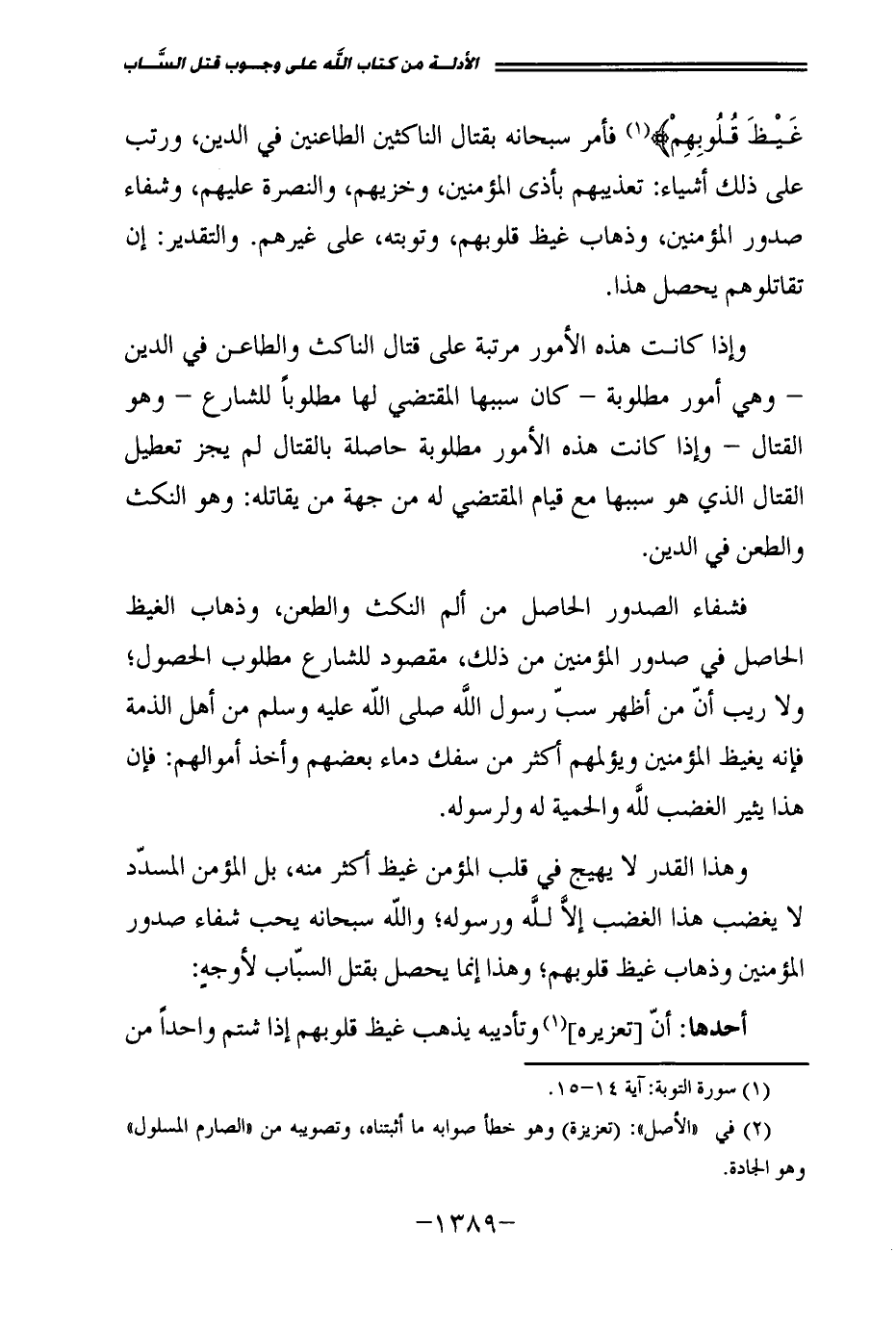 وَإِذَا كَانَتْ هَذِهِ الْأُمُورُ مُرَتَّبَةً عَلَى قِتَالِ النَّاكِثِ وَالطَّاعِنِ فِي الدِّينِ - وَهِيَ أُمُورٌ مَطْلُوبَةٌ - كَانَ سَبَبُهَا الْمُقْتَضِي لَهَا مَطْلُوبًا لِلشَّارِعِ - وَهُوَ الْقِتَالُ - وَإِذَا كَانَتْ هَذِهِ الْأُمُورُ مَطْلُوبَةً حَاصِلَةً بِالْقِتَالِ لَمْ يَجُزْ تَعْطِيلُ الْقِتَالِ الَّذِي هُوَ سَبَبُهَا مَعَ قِيَامِ الْمُقْتَضِي لَهُ مِنْ جِهَةِ مَنْ يُقَاتِلُهُ، وَهُوَ النَّكْثُ وَالطَّعْنُ فِي الدِّينِ.