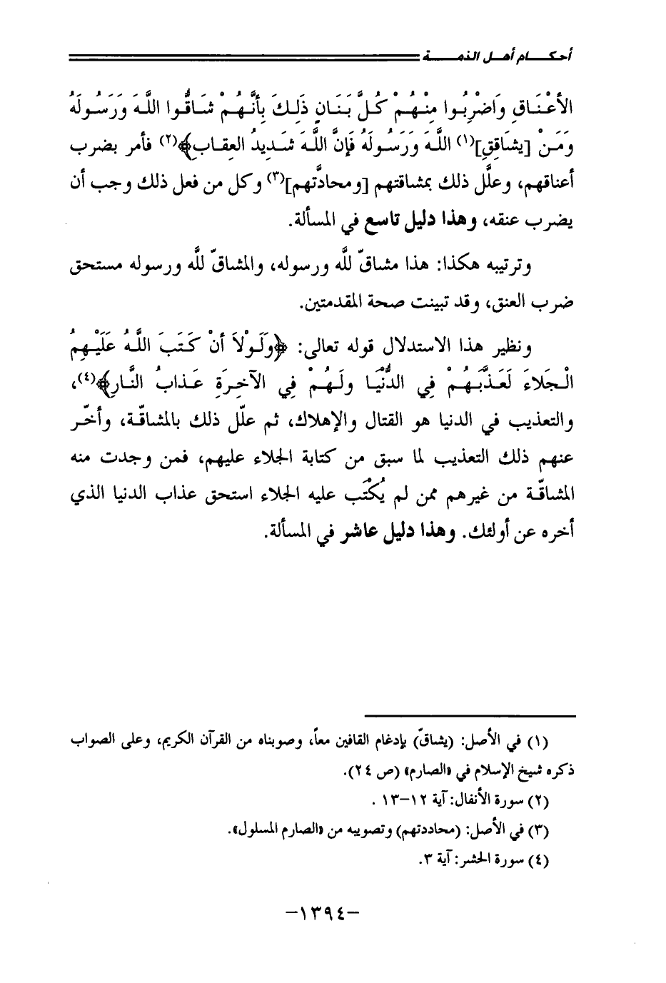 {فَاضْرِبُوا فَوْقَ الْأَعْنَاقِ وَاضْرِبُوا مِنْهُمْ كُلَّ بَنَانٍ - ذَلِكَ بِأَنَّهُمْ شَاقُّوا اللَّهَ وَرَسُولَهُ وَمَنْ [يُشَاقِقِ] اللَّهَ وَرَسُولَهُ فَإِنَّ اللَّهَ شَدِيدُ الْعِقَابِ} [الأنفال: 12 - 13] فَأَمَرَ بِضَرْبِ أَعْنَاقِهِمْ، وَعَلَّلَ ذَلِكَ بِمُشَاقَّتِهِمْ [وَمُحَادَّتِهِمْ] وَكُلُّ مَنْ فَعَلَ ذَلِكَ وَجَبَ أَنْ يُضْرَبَ عُنُقُهُ، وَهَذَا دَلِيلٌ تَاسِعٌ فِي الْمَسْأَلَةِ.