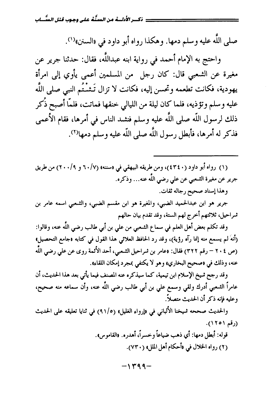 وَاحْتَجَّ بِهِ الْإِمَامُ أَحْمَدُ فِي رِوَايَةِ ابْنِهِ عَبْدِ اللَّهِ فَقَالَ: حَدَّثَنَا جَرِيرٌ، عَنْ مُغِيرَةَ، عَنِ الشَّعْبِيِّ قَالَ: «كَانَ رَجُلٌ مِنَ الْمُسْلِمِينَ أَعْمَى يَأْوِي إِلَى امْرَأَةٍ يَهُودِيَّةٍ، فَكَانَتْ تُطْعِمُهُ وَتُحْسِنُ إِلَيْهِ، فَكَانَتْ لَا تَزَالُ تَشْتُمُ النَّبِيَّ صَلَّى اللَّهُ عَلَيْهِ وَسَلَّمَ وَتُؤْذِيهِ، فَلَمَّا كَانَ لَيْلَةٌ مِنَ اللَّيَالِي خَنَقَهَا فَمَاتَتْ، فَلَمَّا أَصْبَحَ ذُكِرَ ذَلِكَ لِرَسُولِ اللَّهِ صَلَّى اللَّهُ عَلَيْهِ وَسَلَّمَ فَنَشَدَ النَّاسُ فِي أَمْرِهَا، فَقَامَ الْأَعْمَى فَذَكَرَ لَهُ أَمْرَهَا، فَأَبْطَلَ رَسُولُ اللَّهِ صَلَّى اللَّهُ عَلَيْهِ وَسَلَّمَ دَمَهَا» .