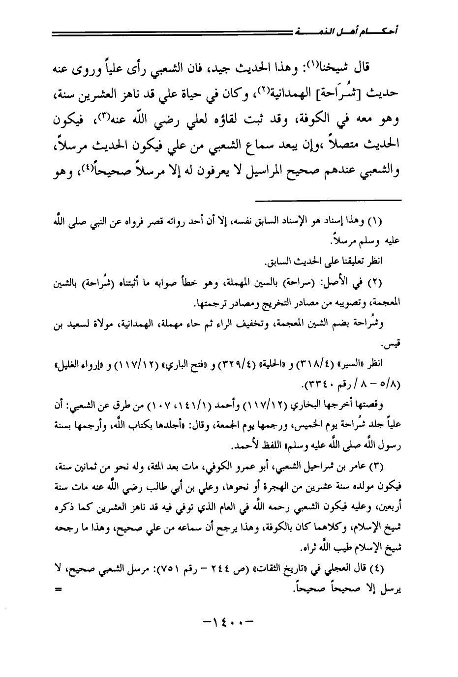 قَالَ شَيْخُنَا: وَهَذَا الْحَدِيثُ جَيِّدٌ، فَإِنَّ الشَّعْبِيَّ رَأَى عَلِيًّا وَرَوَى عَنْهُ حَدِيثَ [شُرَاحَةَ] الْهَمْدَانِيَّةِ، وَكَانَ فِي حَيَاةِ عَلِيٍّ قَدْ نَاهَزَ الْعِشْرِينَ سَنَةً وَهُوَ مَعَهُ فِي الْكُوفَةِ، وَقَدْ ثَبَتَ لِقَاؤُهُ لِعَلِيٍّ رَضِيَ اللَّهُ عَنْهُ فَيَكُونُ الْحَدِيثُ مُتَّصِلًا، وَإِنْ يَبْعُدْ سَمَاعُ الشَّعْبِيِّ مِنْ عَلِيٍّ فَيَكُونُ الْحَدِيثُ مُرْسَلًا، وَالشَّعْبِيُّ عِنْدَهُمْ صَحِيحُ الْمَرَاسِيلِ لَا يَعْرِفُونَ لَهُ إِلَّا مُرْسَلًا صَحِيحًا، وَهُوَ