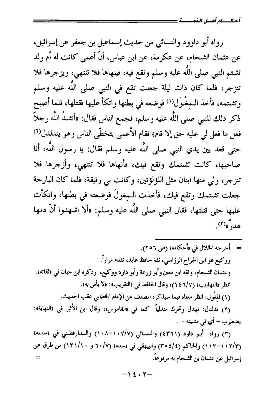 رَوَاهُ أَبُو دَاوُدَ وَالنَّسَائِيُّ مِنْ حَدِيثِ إِسْمَاعِيلَ بْنِ جَعْفَرٍ، عَنْ إِسْرَائِيلَ، عَنْ عُثْمَانَ الشَّحَّامِ، عَنْ عِكْرِمَةَ، عَنِ ابْنِ عَبَّاسٍ: «أَنَّ أَعْمَى كَانَتْ لَهُ أُمُّ وَلَدٍ تَشْتُمُ النَّبِيَّ صَلَّى اللَّهُ عَلَيْهِ وَسَلَّمَ وَتَقَعُ فِيهِ فَيَنْهَاهَا فَلَا تَنْتَهِي وَيَزْجُرُهَا فَلَا تَنْزَجِرُ، فَلَمَّا كَانَ ذَاتُ لَيْلَةٍ جَعَلَتْ تَقَعُ فِي النَّبِيِّ صَلَّى اللَّهُ عَلَيْهِ وَسَلَّمَ وَتَشْتُمُهُ فَأَخَذَ الْمِغْوَلَ فَوَضَعَهُ فِي بَطْنِهَا وَاتَّكَأَ عَلَيْهَا فَقَتَلَهَا، فَلَمَّا أَصْبَحَ ذُكِرَ ذَلِكَ لِلنَّبِيِّ صَلَّى اللَّهُ عَلَيْهِ وَسَلَّمَ، فَجَمَعَ النَّاسَ فَقَالَ: " أَنْشُدُ اللَّهَ رَجُلًا فَعَلَ مَا فَعَلَ، لِي عَلَيْهِ حَقٌّ إِلَّا قَامَ " فَقَامَ الْأَعْمَى يَتَخَطَّى النَّاسَ وَهُوَ يَتَدَلْدَلُ حَتَّى قَعَدَ بَيْنَ يَدَيِ النَّبِيِّ صَلَّى اللَّهُ عَلَيْهِ وَسَلَّمَ فَقَالَ: يَا رَسُولَ اللَّهِ: أَنَا صَاحِبُهَا، كَانَتْ تَشْتُمُكَ وَتَقَعُ فِيكَ فَأَنْهَاهَا فَلَا تَنْتَهِي وَأَزْجُرُهَا فَلَا تَنْزَجِرُ وَلِي مِنْهَا ابْنَانِ مِثْلُ اللُّؤْلُؤَتَيْنِ وَكَانَتْ بِي رَفِيقَةً، فَلَمَّا كَانَ الْبَارِحَةُ جَعَلَتْ تَشْتُمُكَ وَتَقَعُ فِيكَ فَأَخَذْتُ الْمِغْوَلَ فَوَضَعْتُهُ فِي بَطْنِهَا وَاتَّكَأْتُ عَلَيْهَا حَتَّى قَتَلْتُهَا، فَقَالَ النَّبِيُّ صَلَّى اللَّهُ عَلَيْهِ وَسَلَّمَ: " أَلَا اشْهَدُوا أَنَّ دَمَهَا هَدَرٌ» ".