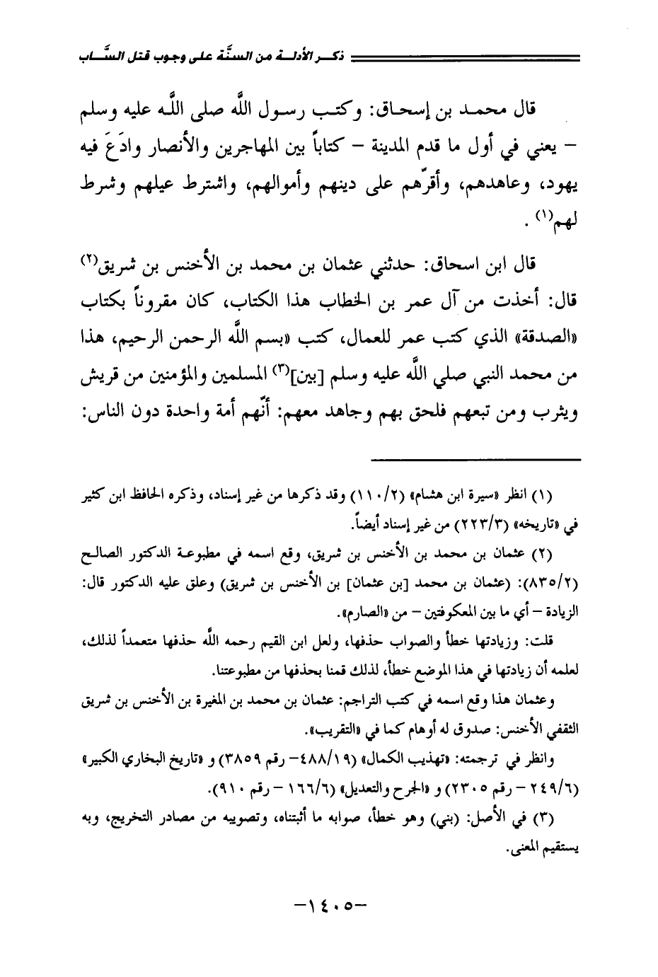 قَالَ ابْنُ إِسْحَاقَ: حَدَّثَنِي عُثْمَانُ بْنُ مُحَمَّدِ بْنِ الْأَخْنَسِ بْنِ شَرِيقٍ قَالَ: أَخَذْتُ مِنْ آلِ عُمَرَ بْنِ الْخَطَّابِ هَذَا الْكِتَابَ، كَانَ مَقْرُونًا بِكِتَابِ " الصَّدَقَةِ " الَّذِي كَتَبَ عُمَرُ لِلْعُمَّالِ، كَتَبَ: " بِسْمِ اللَّهِ الرَّحْمَنِ الرَّحِيمِ، هَذَا مِنْ مُحَمَّدِ النَّبِيِّ صَلَّى اللَّهُ عَلَيْهِ وَسَلَّمَ [بَيْنَ] الْمُسْلِمِينَ وَالْمُؤْمِنِينَ مِنْ قُرَيْشٍ وَيَثْرِبَ وَمَنْ تَبِعَهُمْ فَلَحِقَ بِهِمْ وَجَاهَدَ مَعَهُمْ، أَنَّهُمْ أُمَّةٌ وَاحِدَةٌ دُونَ النَّاسِ