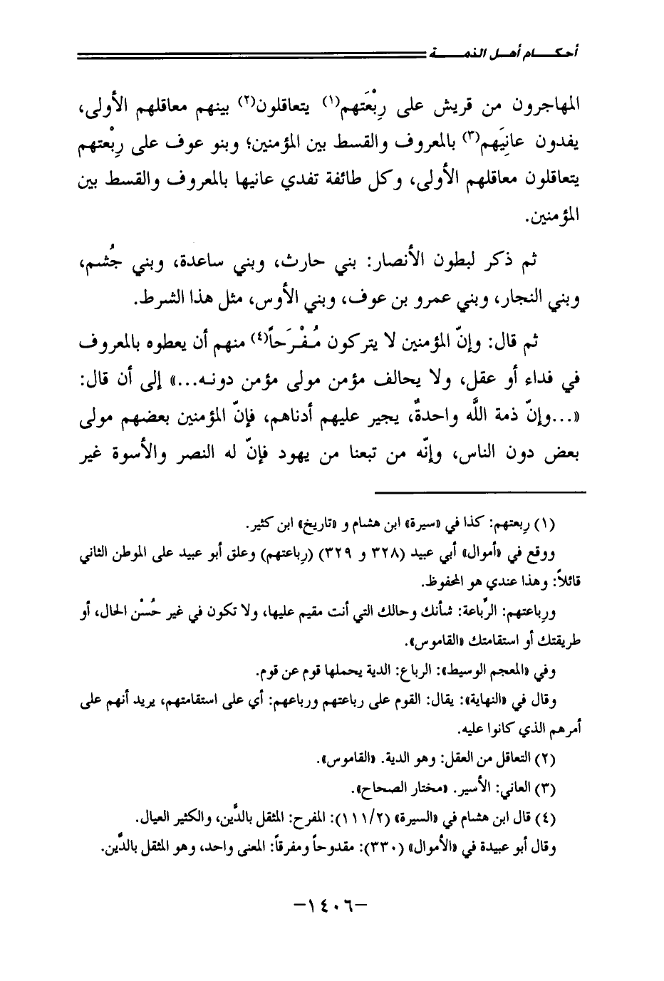 ثُمَّ قَالَ: وَإِنَّ الْمُؤْمِنِينَ لَا يَتْرُكُونَ مُفْرَحًا مِنْهُمْ أَنْ يُعْطُوهُ بِالْمَعْرُوفِ فِي فِدَاءٍ أَوْ عَقْلٍ، وَلَا يُحَالِفُ مُؤْمِنٌ مَوْلَى مُؤْمِنٍ دُونَهُ. . . " إِلَى أَنْ قَالَ: ". . . وَإِنَّ ذِمَّةَ اللَّهِ وَاحِدَةٌ يُجِيرُ عَلَيْهِمْ أَدْنَاهُمْ، فَإِنَّ الْمُؤْمِنِينَ بَعْضُهُمْ مَوْلَى بَعْضٍ دُونَ النَّاسِ، وَإِنَّهُ مَنْ تَبِعَنَا مِنْ يَهُودَ فَإِنَّ لَهُ النَّصْرَ وَالْأُسْوَةَ غَيْرُ