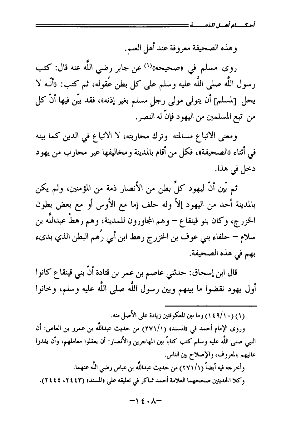 رَوَى مُسْلِمٌ فِي " صَحِيحِهِ " عَنْ جَابِرٍ رَضِيَ اللَّهُ عَنْهُ قَالَ: «كَتَبَ رَسُولُ اللَّهِ صَلَّى اللَّهُ عَلَيْهِ وَسَلَّمَ عَلَى كُلِّ بَطْنٍ عُقُولَهُ، ثُمَّ كَتَبَ: " أَنَّهُ لَا يَحِلُّ [لِمُسْلِمٍ] أَنْ يَتَوَلَّى مَوْلَى رَجُلٍ مُسْلِمٍ بِغَيْرِ إِذْنِهِ» ". فَقَدْ بَيَّنَ فِيهَا أَنَّ كُلَّ مَنْ تَبِعَ الْمُسْلِمِينَ مِنَ الْيَهُودِ فَإِنَّ لَهُ النَّصْرَ.