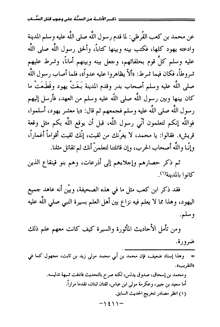 فَقَدْ ذَكَرَ ابْنُ كَعْبٍ مِثْلَ مَا فِي هَذِهِ الصَّحِيفَةِ، وَبَيَّنَ أَنَّهُ عَاهَدَ جَمِيعَ الْيَهُودِ، وَهَذَا مِمَّا لَا يُعْلَمُ فِيهِ نِزَاعٌ بَيْنَ أَهْلِ الْعِلْمِ بِسِيرَةِ النَّبِيِّ صَلَّى اللَّهُ عَلَيْهِ وَسَلَّمَ.