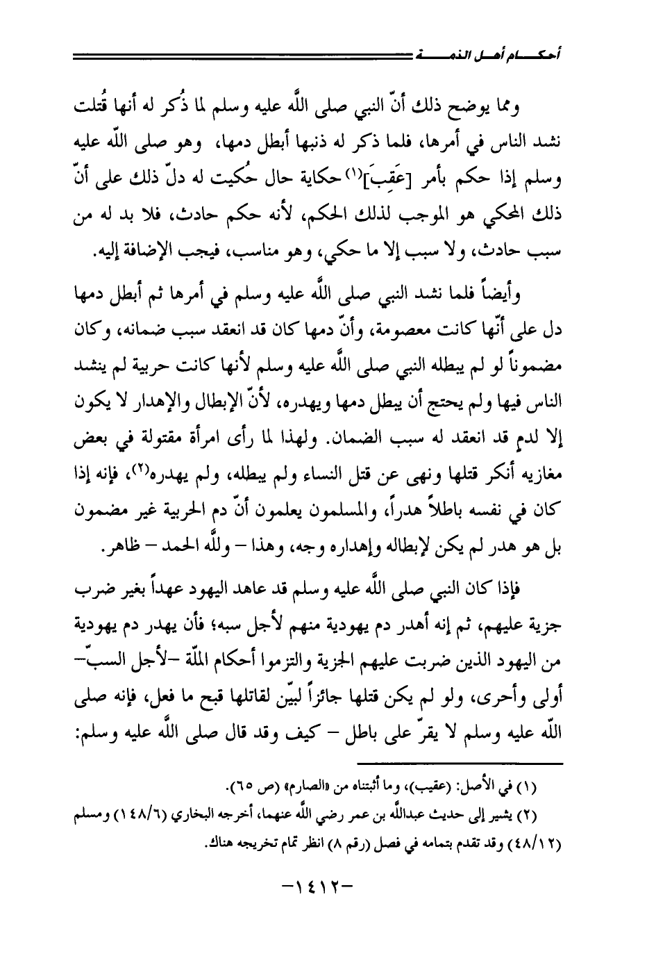 وَأَيْضًا فَلَمَّا نَشَدَ النَّبِيُّ صَلَّى اللَّهُ عَلَيْهِ وَسَلَّمَ فِي أَمْرِهَا ثُمَّ أَبْطَلَ دَمَهَا دَلَّ عَلَى أَنَّهَا كَانَتْ مَعْصُومَةً، وَأَنَّ دَمَهَا كَانَ قَدِ انْعَقَدَ سَبَبُ ضَمَانِهِ، وَكَانَ مَضْمُونًا لَوْ لَمْ يُبْطِلْهُ النَّبِيُّ صَلَّى اللَّهُ عَلَيْهِ وَسَلَّمَ؛ لِأَنَّهَا كَانَتْ حَرْبِيَّةً لَمْ يَنْشُدِ النَّاسَ فِيهَا وَلَمْ يَحْتَجْ أَنْ يُبْطِلَ دَمَهَا وَيُهْدِرَهُ لِأَنَّ الْإِبْطَالَ وَالْإِهْدَارَ لَا يَكُونُ إِلَّا لِدَمٍ قَدِ انْعَقَدَ لَهُ سَبَبُ الضَّمَانِ، وَلِهَذَا لَمَّا رَأَى امْرَأَةً مَقْتُولَةً فِي بَعْضِ مَغَازِيهِ أَنْكَرَ قَتْلَهَا وَنَهَى عَنْ قَتْلِ النِّسَاءِ، وَلَمْ يُبْطِلْهُ وَلَمْ يُهْدِرْهُ، فَإِنَّهُ إِذَا كَانَ فِي نَفْسِهِ بَاطِلًا هَدَرًا، وَالْمُسْلِمُونَ يَعْلَمُونَ أَنَّ دَمَ الْحَرْبِيَّةِ غَيْرُ مَضْمُونٍ بَلْ هُوَ هَدَرٌ لَمْ يَكُنْ لِإِبْطَالِهِ وَإِهْدَارِهِ وَجْهٌ، وَهَذَا - وَلِلَّهِ الْحَمْدُ - ظَاهِرٌ.