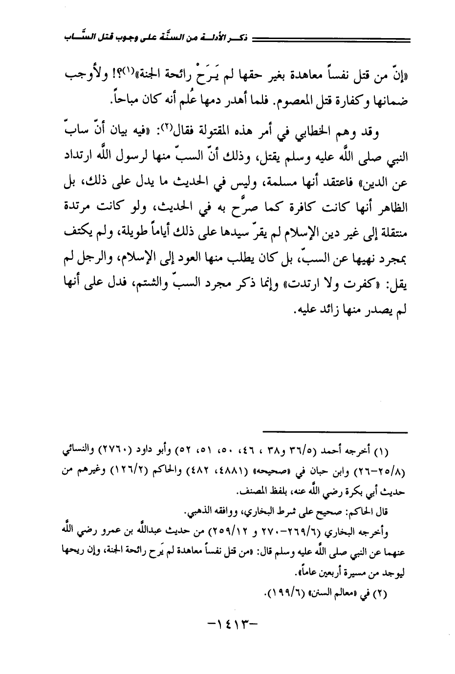 " «إِنَّ مَنْ قَتَلَ نَفْسًا مُعَاهَدَةً بِغَيْرِ حَقِّهَا لَمْ يَرِحْ رَائِحَةَ الْجَنَّةِ» ". وَلَأَوْجَبَ ضَمَانَهَا وَكَفَّارَةَ قَتْلِ الْمَعْصُومِ، فَلَمَّا أَهْدَرَ دَمَهَا عُلِمَ أَنَّهُ كَانَ مُبَاحًا.