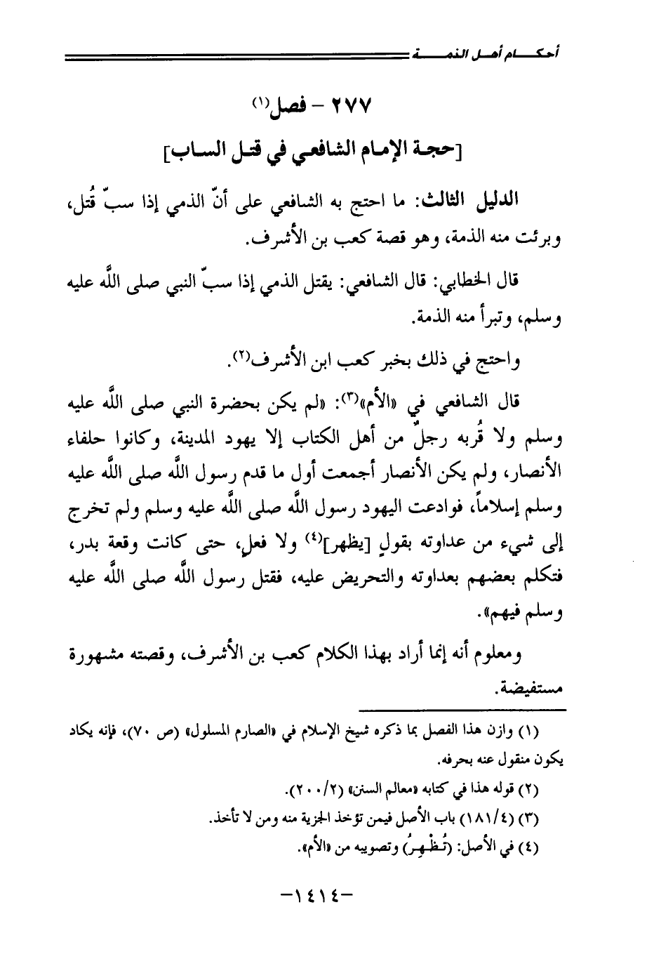 الدَّلِيلُ الثَّالِثُ: مَا احْتَجَّ بِهِ الشَّافِعِيُّ عَلَى أَنَّ الذِّمِّيَّ إِذَا سَبَّ قُتِلَ وَبَرِئَتْ مِنْهُ الذِّمَّةُ، وَهُوَ قِصَّةُ كَعْبِ بْنِ الْأَشْرَفِ.