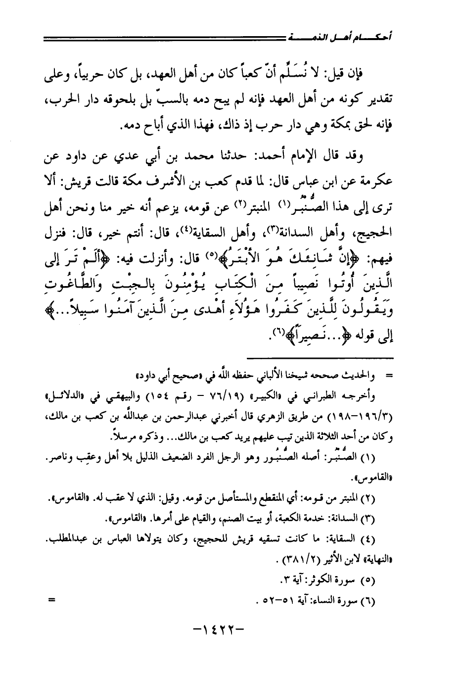 وَقَدْ قَالَ الْإِمَامُ أَحْمَدُ: حَدَّثَنَا مُحَمَّدُ بْنُ أَبِي عَدِيٍّ، عَنْ دَاوُدَ، عَنْ عِكْرِمَةَ، عَنِ ابْنِ عَبَّاسٍ قَالَ: لَمَّا قَدِمَ كَعْبُ بْنُ الْأَشْرَفِ مَكَّةَ قَالَتْ قُرَيْشٌ: " أَلَا تَرَى إِلَى هَذَا الصُّنْبُرِ الْمُنْبَتِرِ عَنْ قَوْمِهِ، يَزْعُمُ أَنَّهُ خَيْرٌ مِنَّا وَنَحْنُ أَهْلُ الْحَجِيجِ وَأَهْلُ السَّدَانَةِ وَأَهْلُ السِّقَايَةِ، قَالَ: أَنْتُمْ خَيْرٌ، قَالَ: فَنَزَلَ فِيهِمْ: {إِنَّ شَانِئَكَ هُوَ الْأَبْتَرُ} [الكوثر: 3] قَالَ: وَأُنْزِلَتْ فِيهِ: {أَلَمْ تَرَ إِلَى الَّذِينَ أُوتُوا نَصِيبًا مِنَ الْكِتَابِ يُؤْمِنُونَ بِالْجِبْتِ وَالطَّاغُوتِ وَيَقُولُونَ لِلَّذِينَ كَفَرُوا هَؤُلَاءِ أَهْدَى مِنَ الَّذِينَ آمَنُوا سَبِيلًا} [النساء: 51] إِلَى قَوْلِهِ: (نَصِيرًا)