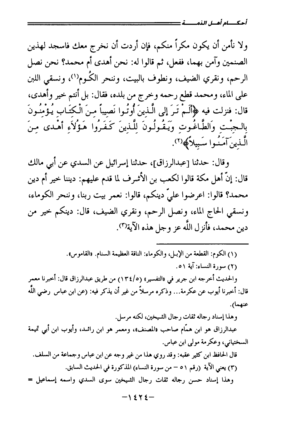 وَقَالَ: حَدَّثَنَا [عَبْدُ الرَّزَّاقِ] ، حَدَّثَنَا إِسْرَائِيلُ، عَنِ السُّدِّيِّ، عَنْ أَبِي مَالِكٍ قَالَ: إِنَّ أَهْلَ مَكَّةَ قَالُوا لِكَعْبِ بْنِ الْأَشْرَفِ لَمَّا قَدِمَ عَلَيْهِمْ: دِينُنَا خَيْرٌ أَمْ دِينُ مُحَمَّدٍ؟ قَالُوا: اعْرِضُوا عَلَيَّ دِينَكُمْ، قَالُوا: نُعَمِّرُ بَيْتَ رَبِّنَا وَنَنْحَرُ الْكَوْمَاءَ وَنَسْقِي الْحَاجَّ الْمَاءَ وَنَصِلُ الرَّحِمَ وَنُقْرِي الضَّيْفَ، قَالَ: دِينُكُمْ خَيْرٌ مِنْ دِينِ مُحَمَّدٍ، فَأَنْزَلَ اللَّهُ عَزَّ وَجَلَّ هَذِهِ الْآيَةَ.
