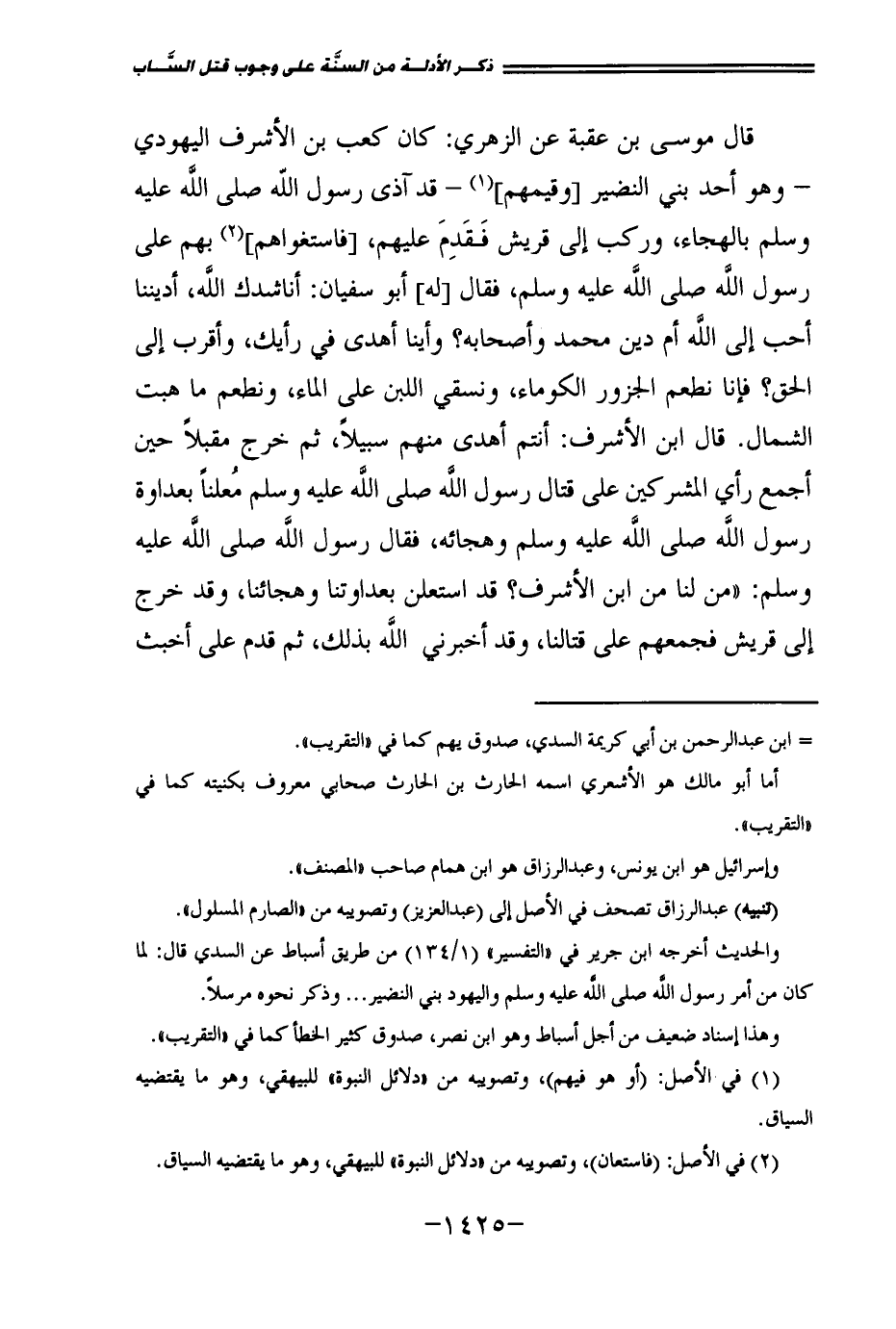 قَالَ مُوسَى بْنُ عُقْبَةَ، عَنِ الزُّهْرِيِّ: «كَانَ كَعْبُ بْنُ الْأَشْرَفِ الْيَهُودِيُّ - وَهُوَ أَحَدُ بَنِي النَّضِيرِ [وَقَيِّمُهُمْ]- قَدْ آذَى رَسُولَ اللَّهِ صَلَّى اللَّهُ عَلَيْهِ وَسَلَّمَ بِالْهِجَاءِ، وَرَكِبَ إِلَى قُرَيْشٍ فَقَدِمَ عَلَيْهِمْ، [فَاسْتَغْوَاهُمْ] بِهَمْ عَلَى رَسُولِ اللَّهِ صَلَّى اللَّهُ عَلَيْهِ وَسَلَّمَ فَقَالَ [لَهُ] أَبُو سُفْيَانَ: أُنَاشِدُكَ اللَّهَ، أَدِينُنَا أَحَبُّ إِلَى اللَّهِ أَمْ دِينُ مُحَمَّدٍ وَأَصْحَابِهِ؟ وَأَيُّنَا أَهْدَى فِي رَأْيِكَ وَأَقْرَبُ إِلَى الْحَقِّ؟ فَإِنَّا نُطْعِمُ الْجَزُورَ الْكَوْمَاءَ وَنَسْقِي اللَّبَنَ عَلَى الْمَاءِ وَنُطْعِمُ مَا هَبَّتِ الشَّمَالُ. قَالَ ابْنُ الْأَشْرَفِ: أَنْتُمْ أَهْدَى مِنْهُمْ سَبِيلًا، ثُمَّ خَرَجَ مُقْبِلًا حِينَ أَجْمَعَ رَأْيُ الْمُشْرِكِينَ عَلَى قِتَالِ رَسُولِ اللَّهِ صَلَّى اللَّهُ عَلَيْهِ وَسَلَّمَ مُعْلِنًا بِعَدَاوَةِ رَسُولِ اللَّهِ صَلَّى اللَّهُ عَلَيْهِ وَسَلَّمَ وَهِجَائِهِ، فَقَالَ رَسُولُ اللَّهِ صَلَّى اللَّهُ عَلَيْهِ وَسَلَّمَ: " مَنْ لَنَا مِنِ ابْنِ الْأَشْرَفِ؟ قَدِ اسْتَعْلَنَ بِعَدَاوَتِنَا وَهِجَائِنَا، وَقَدْ خَرَجَ إِلَى قُرَيْشٍ فَجَمَعَهُمْ عَلَى قِتَالِنَا، وَقَدْ أَخْبَرَنِي اللَّهُ بِذَلِكَ، ثُمَّ قَدِمَ عَلَى أَخْبَثِ