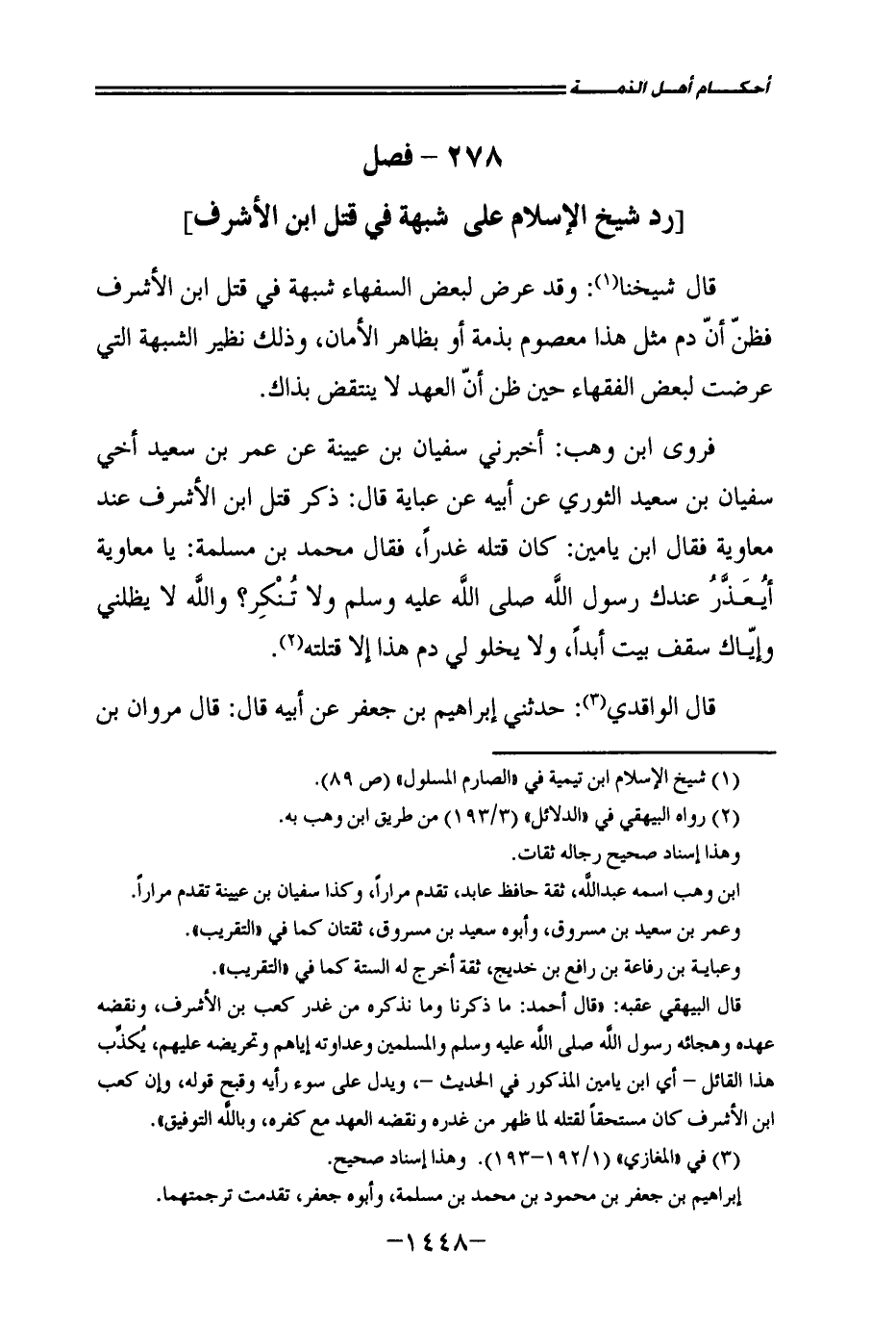 قَالَ شَيْخُنَا: وَقَدْ عَرَضَ لِبَعْضِ السُّفَهَاءِ شُبْهَةٌ فِي قَتْلِ ابْنِ الْأَشْرَفِ فَظَنَّ أَنَّ دَمَ مِثْلَ هَذَا مَعْصُومٌ بِذِمَّةٍ أَوْ بِظَاهِرِ الْأَمَانِ، وَذَلِكَ نَظِيرُ الشُّبْهَةِ الَّتِي عَرَضَتْ لِبَعْضِ الْفُقَهَاءِ حِينَ ظَنَّ أَنَّ الْعَهْدَ لَا يَنْتَقِضُ بِذَاكَ.