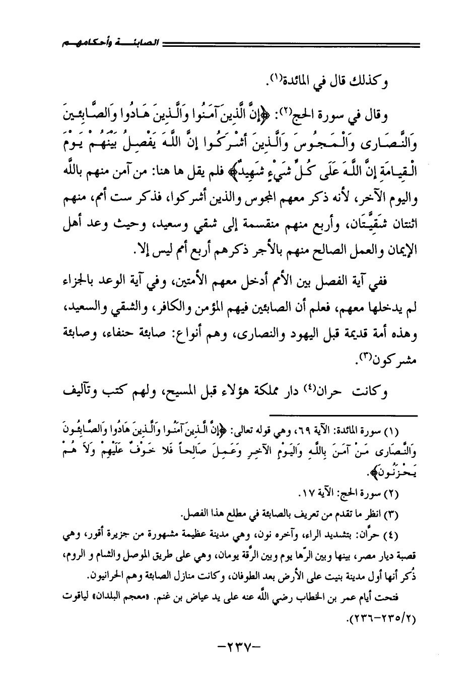 فَفِي آيَةِ الْفَصْلِ بَيْنَ الْأُمَمِ أَدْخَلَ مَعَهُمُ الْأُمَّتَيْنِ، وَفِي آيَةِ الْوَعْدِ بِالْجَزَاءِ لَمْ يُدْخِلْهَا مَعَهُمْ، فَعُلِمَ أَنَّ الصَّابِئِينَ فِيهِمُ الْمُؤْمِنُ وَالْكَافِرُ وَالشَّقِيُّ وَالسَّعِيدُ وَهَذِهِ أُمَّةٌ قَدِيمَةٌ قَبْلَ الْيَهُودِ وَالنَّصَارَى وَهُمْ أَنْوَاعٌ: صَابِئَةٌ حُنَفَاءُ وَصَابِئَةٌ مُشْرِكُونَ.