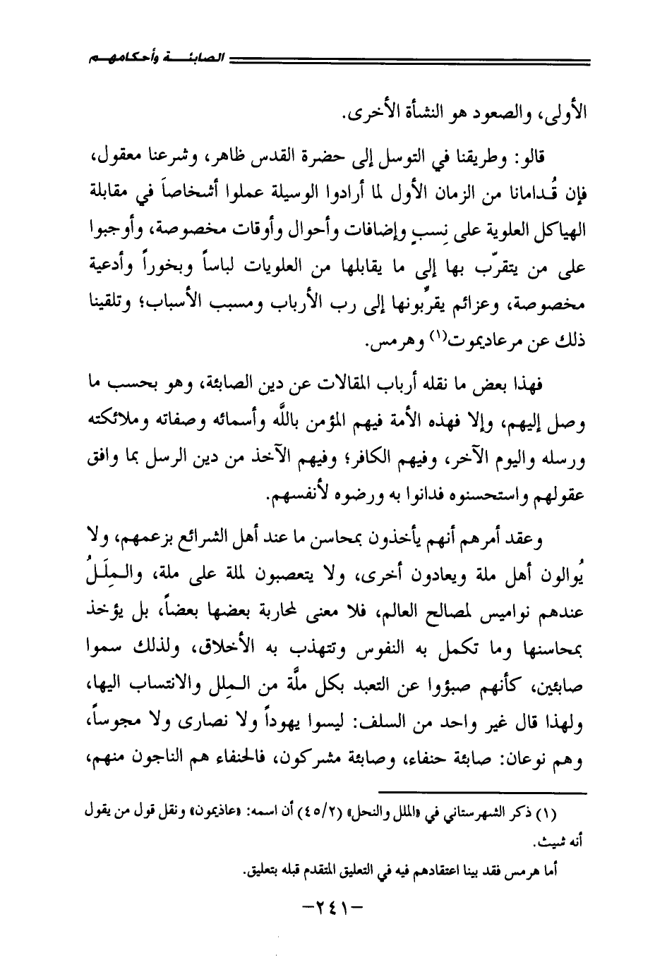 فَهَذَا بَعْضُ مَا نَقَلَهُ أَرْبَابُ الْمَقَالَاتِ عَنْ دِينِ الصَّابِئَةِ، وَهُوَ بِحَسَبِ مَا وَصَلَ إِلَيْهِمْ، وَإِلَّا فَهَذِهِ الْأُمَّةُ فِيهِمُ الْمُؤْمِنُ بِاللَّهِ وَأَسْمَائِهِ وَصِفَاتِهِ وَمَلَائِكَتِهِ وَرُسُلِهِ وَالْيَوْمِ الْآخِرِ، وَفِيهِمُ الْكَافِرُ وَفِيهِمُ الْآخِذُ مِنْ دِينِ الرُّسُلِ بِمَا وَافَقَ عُقُولَهُمْ وَاسْتَحْسَنُوهُ فَدَانُوا بِهِ وَرَضُوهُ لِأَنْفُسِهِمْ.