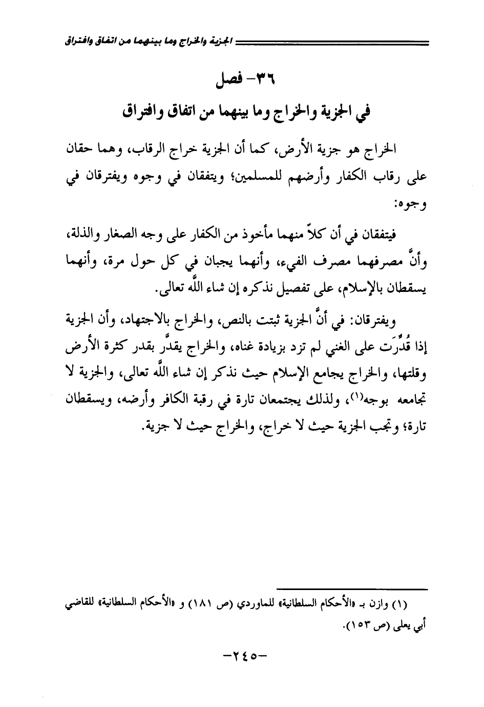 فِي الْجِزْيَةِ وَالْخَرَاجِ وَمَا بَيْنَهُمَا مِنِ اتِّفَاقٍ وَافْتِرَاقٍ.