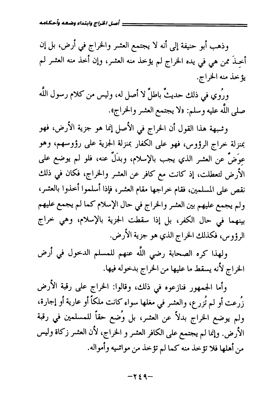 وَرُوِيَ فِي ذَلِكَ حَدِيثٌ بَاطِلٌ لَا أَصْلَ لَهُ، وَلَيْسَ مِنْ كَلَامِ رَسُولِ اللَّهِ - صَلَّى اللَّهُ عَلَيْهِ وَسَلَّمَ -: " «لَا يَجْتَمِعُ الْعُشْرُ وَالْخَرَاجُ» ".