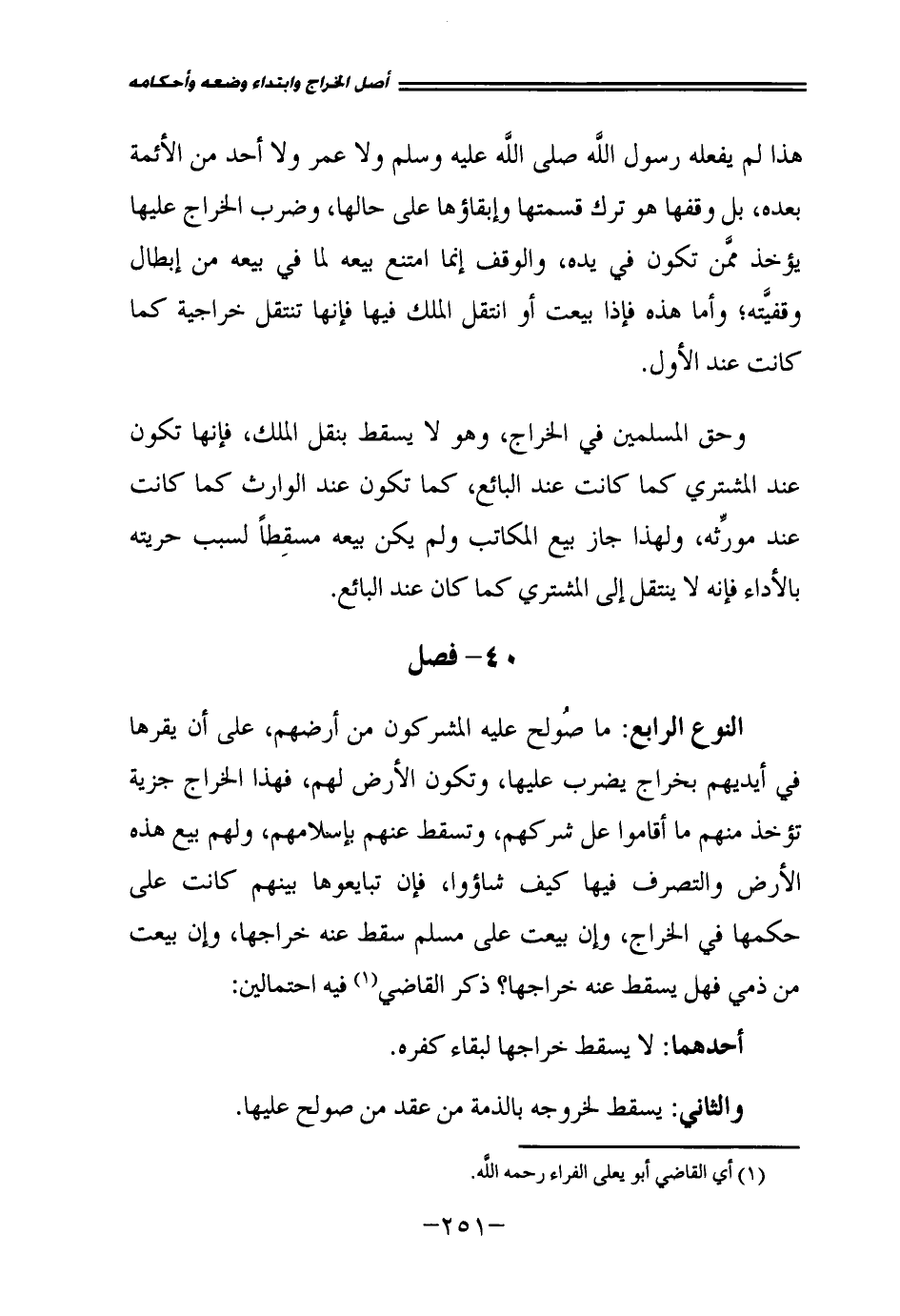 النَّوْعُ الرَّابِعُ: مَا صُولِحَ عَلَيْهِ الْمُشْرِكُونَ مِنْ أَرْضِهِمْ عَلَى أَنْ يُقِرَّهَا فِي أَيْدِيهِمْ بِخَرَاجٍ يُضْرَبُ عَلَيْهَا، وَتَكُونُ الْأَرْضُ لَهُمْ فَهَذَا الْخَرَاجُ جِزْيَةٌ تُؤْخَذُ مِنْهُمْ مَا أَقَامُوا عَلَى شِرْكِهِمْ، وَتَسْقُطُ عَنْهُمْ بِإِسْلَامِهِمْ وَلَهُمْ بَيْعُ هَذِهِ الْأَرْضِ وَالتَّصَرُّفُ فِيهَا كَيْفَ شَاءُوا، فَإِنْ تَبَايَعُوهَا بَيْنَهُمْ كَانَتْ عَلَى حُكْمِهَا فِي الْخَرَاجِ، وَإِنْ بِيعَتْ عَلَى مُسْلِمٍ سَقَطَ عَنْهُ خَرَاجُهَا وَإِنْ بِيعَتْ مِنْ ذِمِّيٍّ فَهَلْ يَسْقُطُ عَنْهُ خَرَاجُهَا؟ ذَكَرَ الْقَاضِي فِيهِ احْتِمَالَيْنِ: