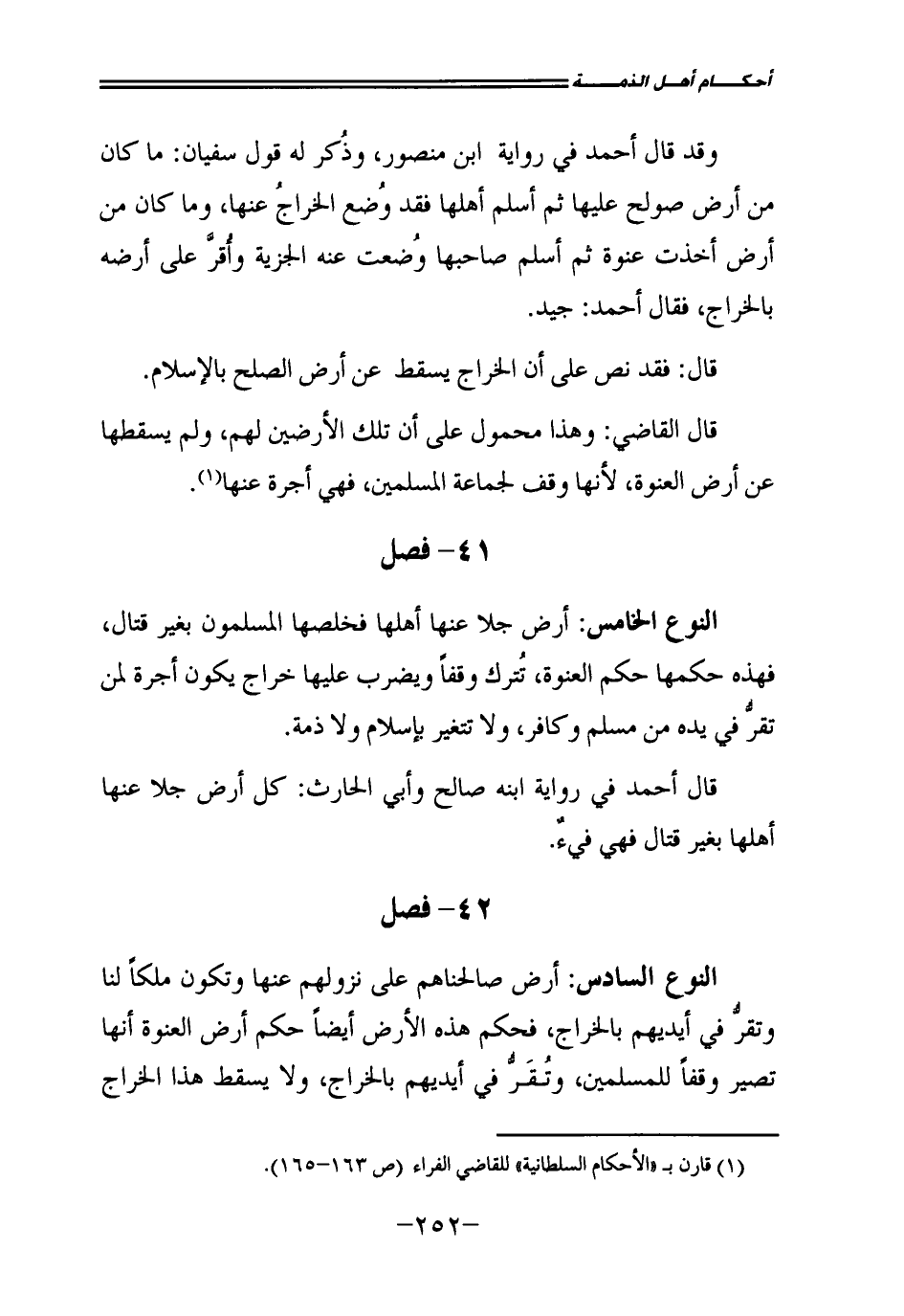 وَقَدْ قَالَ أَحْمَدُ فِي رِوَايَةِ ابْنِ مَنْصُورٍ، وَذَكَرَ لَهُ قَوْلَ سُفْيَانَ: مَا كَانَ مِنْ أَرْضٍ صُولِحَ عَلَيْهَا ثُمَّ أَسْلَمَ أَهْلُهَا فَقَدْ وُضِعَ الْخَرَاجُ عَنْهَا، وَمَا كَانَ مِنْ أَرْضٍ أُخِذَتْ عَنْوَةً ثُمَّ أَسْلَمَ صَاحِبُهَا وُضِعَتْ عَنْهُ الْجِزْيَةُ وَأُقِرَّ عَلَى أَرْضِهِ بِالْخَرَاجِ فَقَالَ أَحْمَدُ: جَيِّدٌ.