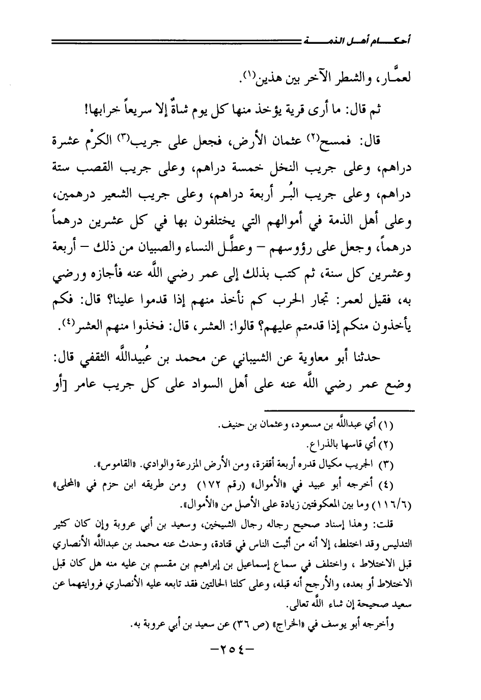 قَالَ: فَمَسَحَ عُثْمَانُ الْأَرْضَ فَجَعَلَ عَلَى جَرِيبِ الْكَرْمِ عَشَرَةَ دَرَاهِمَ، وَعَلَى جَرِيبِ النَّخْلِ خَمْسَةَ دَرَاهِمَ، وَعَلَى جَرِيبِ الْقَصَبِ سِتَّةَ دَرَاهِمَ، وَعَلَى جَرِيبِ الْبُرِّ أَرْبَعَةَ دَرَاهِمَ، وَعَلَى جَرِيبِ الشَّعِيرِ دِرْهَمَيْنِ، وَعَلَى أَهْلِ الذِّمَّةِ فِي أَمْوَالِهِمُ الَّتِي يَخْتَلِفُونَ بِهَا فِي كُلِّ عِشْرِينَ دِرْهَمًا دِرْهَمًا، وَجَعَلَ عَلَى رُءُوسِهِمْ - وَعَطَّلَ النِّسَاءَ وَالصِّبْيَانَ مِنْ ذَلِكَ - أَرْبَعَةً وَعِشْرِينَ كُلَّ سَنَّةٍ، ثُمَّ كَتَبَ بِذَلِكَ إِلَى عُمَرَ رَضِيَ اللَّهُ عَنْهُ فَأَجَازَهُ وَرَضِيَ بِهِ، فَقِيلَ لِعُمُرَ: تُجَّارُ الْحَرْبِ كَمْ نَأْخُذُ مِنْهُمْ إِذَا قَدِمُوا عَلَيْنَا؟ قَالَ: فَكَمْ يَأْخُذُونَ مِنْكُمْ إِذَا قَدِمْتُمْ عَلَيْهِمْ؟ قَالُوا: الْعُشْرُ، قَالَ: فَخُذُوا مِنْهُمُ الْعُشْرَ.