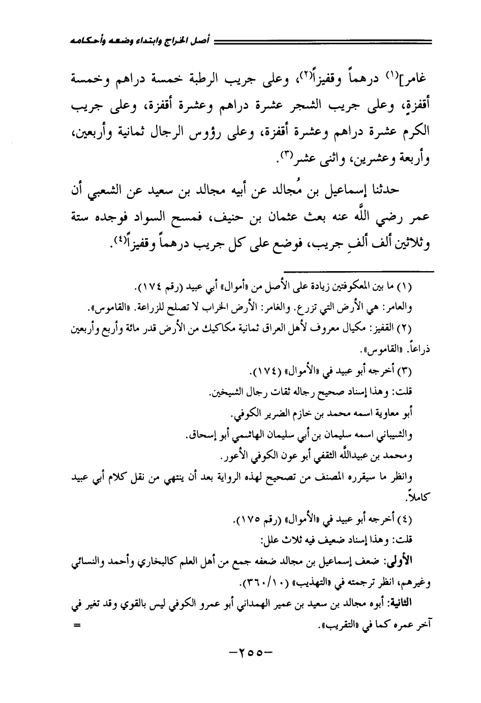 حَدَّثَنَا إِسْمَاعِيلُ بْنُ مُجَالِدٍ عَنْ أَبِيهِ مُجَالِدِ بْنِ سَعِيدٍ عَنِ الشَّعْبِيِّ أَنَّ عُمَرَ رَضِيَ اللَّهُ عَنْهُ بَعَثَ عُثْمَانَ بْنَ حُنَيْفٍ، فَمَسَحَ السَّوَادَ فَوَجَدَهُ سِتَّةً وَثَلَاثِينَ أَلْفَ أَلْفِ جَرِيبٍ، فَوَضَعَ عَلَى كُلِّ جَرِيبٍ دِرْهَمًا وَقَفِيزًا.
