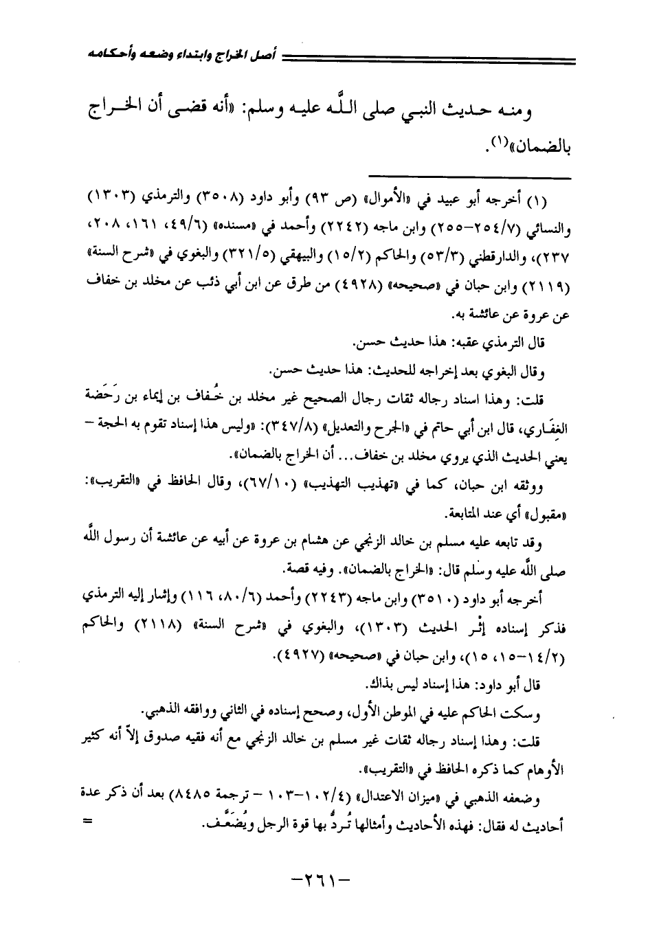 وَمِنْهُ حَدِيثُ النَّبِيِّ - صَلَّى اللَّهُ عَلَيْهِ وَسَلَّمَ -: " «أَنَّهُ قَضَى أَنَّ الْخَرَاجَ بِالضَّمَانِ» ".