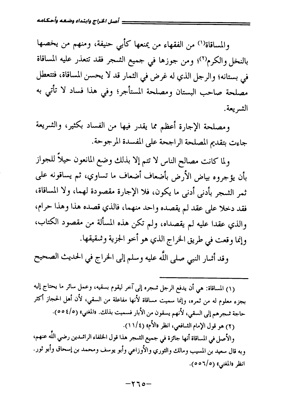 وَلَمَّا كَانَتْ مَصَالِحُ النَّاسِ لَا تَتِمُّ إِلَّا بِذَلِكَ وَضَعَ الْمَانِعُونَ حِيَلًا لِلْجَوَازِ بِأَنْ يُؤَجِّرُوهُ بَيَاضَ الْأَرْضِ بِأَضْعَافِ أَضْعَافِ مَا تُسَاوِي، ثُمَّ يُسَاقُونَهُ عَلَى ثَمَرِ الشَّجَرِ بِأَدْنَى أَدْنَى مَا يَكُونُ فَلَا الْإِجَارَةُ مَقْصُودَةٌ لَهُمَا وَلَا الْمُسَاقَاةُ فَقَدْ دَخَلَا عَلَى عَقْدٍ لَمْ يَقْصِدْهُ وَاحِدٌ مِنْهُمَا، فَالَّذِي قَصَدَهُ هَذَا وَهَذَا حَرَامٌ وَالَّذِي عَقَدَا عَلَيْهِ لَمْ يَقْصِدَاهُ وَلَمْ تَكُنْ هَذِهِ الْمَسْأَلَةُ مِنْ مَقْصُودِ الْكِتَابِ، وَإِنَّمَا وَقَعَتْ فِي طَرِيقِ الْخَرَاجِ الَّذِي هُوَ أَخُو الْجِزْيَةِ وَشَقِيقُهَا.