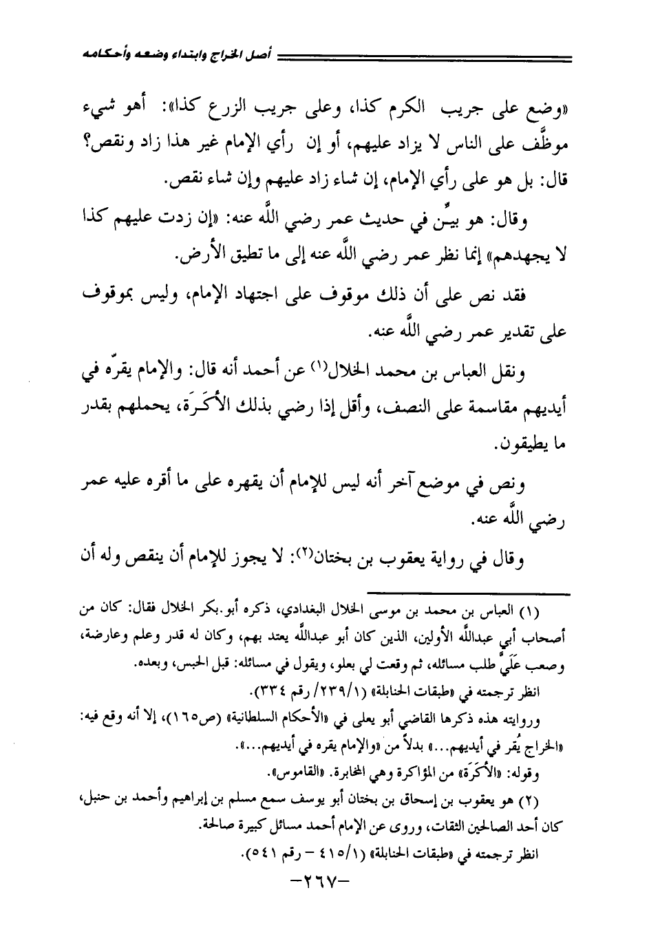 وَنَقَلَ الْعَبَّاسُ بْنُ مُحَمَّدٍ الْخَلَّالُ عَنْ أَحْمَدَ أَنَّهُ قَالَ: وَالْإِمَامُ يُقِرُّهُ فِي أَيْدِيهِمْ مُقَاسَمَةً عَلَى النِّصْفِ، وَأَقَلَّ إِذَا رَضِيَ بِذَلِكَ الْأَكَرَةُ يُحَمِّلُهُمْ بِقَدْرِ مَا يُطِيقُونَ.