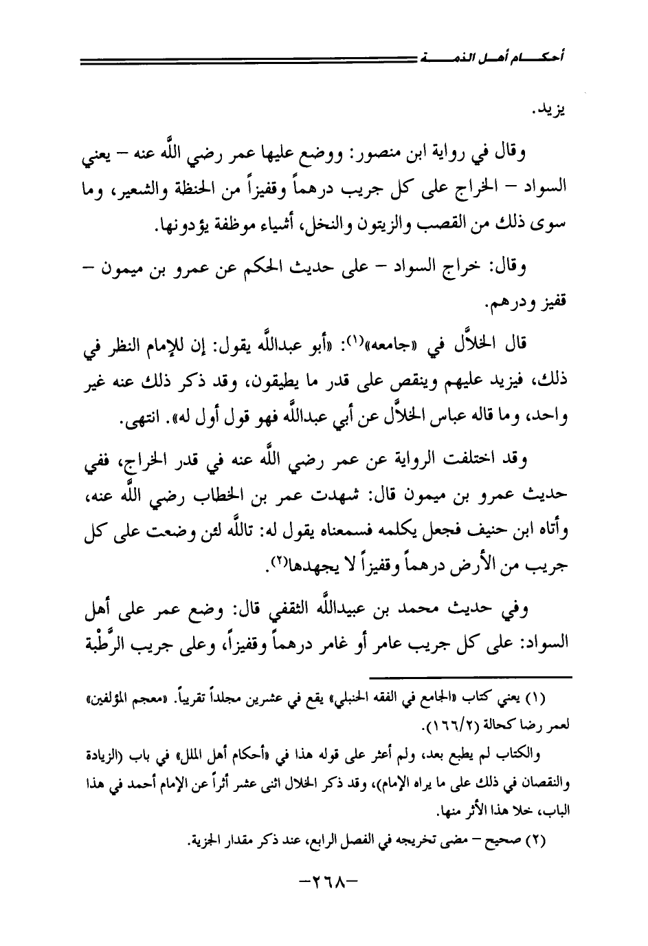 وَقَالَ فِي رِوَايَةِ ابْنِ مَنْصُورٍ: وَوَضَعَ عَلَيْهَا عُمَرُ رَضِيَ اللَّهُ عَنْهُ - يَعْنِي السَّوَادَ - الْخَرَاجَ عَلَى كُلِّ جَرِيبٍ دِرْهَمًا وَقَفِيزًا مِنَ الْحِنْطَةِ وَالشَّعِيرِ، وَمَا سِوَى ذَلِكَ مِنَ الْقَصَبِ وَالزَّيْتُونِ وَالنَّخْلِ أَشْيَاءَ مُوَظَّفَةً يُؤَدُّونَهَا.