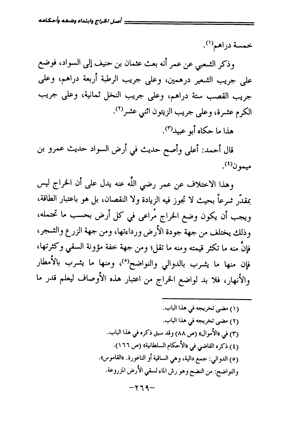وَهَذَا الِاخْتِلَافُ عَنْ عُمَرَ رَضِيَ اللَّهُ عَنْهُ يَدُلُّ عَلَى أَنَّ الْخَرَاجَ لَيْسَ بِمُقَدَّرٍ شَرْعًا بِحَيْثُ لَا تَجُوزُ فِيهِ الزِّيَادَةُ وَلَا النُّقْصَانُ بَلْ هُوَ بِاعْتِبَارِ الطَّاقَةِ وَيَجِبُ أَنْ يَكُونَ وَضْعُ الْخَرَاجِ مُرَاعًى فِي كُلِّ أَرْضٍ بِحَسَبِ مَا تَحْتَمِلُهُ وَذَلِكَ يَخْتَلِفُ مِنْ جِهَةِ جَوْدَةِ الْأَرْضِ وَرَدَاءَتِهَا وَمِنْ جِهَةِ الزَّرْعِ وَالشَّجَرِ، فَإِنَّ مِنْهُ مَا تَكْثُرُ قِيمَتُهُ وَمِنْهُ مَا تَقِلُّ وَمِنْ جِهَةِ خِفَّةِ مَئُونَةِ السَّقْيِ وَكَثْرَتِهَا، فَإِنَّ مِنْهَا مَا يَشْرَبُ بِالدَّوَالِي وَالنَّوَاضِحِ، وَمِنْهَا مَا يَشْرَبُ بِالْأَمْطَارِ وَالْأَنْهَارِ فَلَا بُدَّ لِوَاضِعِ الْخَرَاجِ مِنِ اعْتِبَارِ هَذِهِ الْأَوْصَافِ، لِيَعْلَمَ قَدْرَ مَا