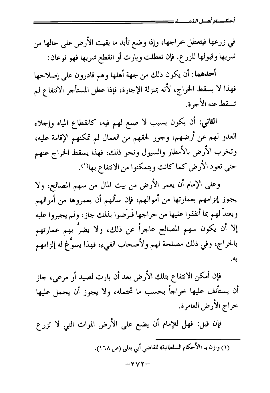 أَحَدُهُمَا: أَنْ يَكُونَ ذَلِكَ مِنْ جِهَةِ أَهْلِهَا وَهُمْ قَادِرُونَ عَلَى إِصْلَاحِهَا فَهَذَا لَا يُسْقِطُ الْخَرَاجَ ; لِأَنَّهُ بِمَنْزِلَةِ الْإِجَارَةِ فَإِذَا عَطَّلَ الْمُسْتَأْجِرُ الِانْتِفَاعَ لَمْ تَسْقُطْ عَنْهُ الْأُجْرَةُ.