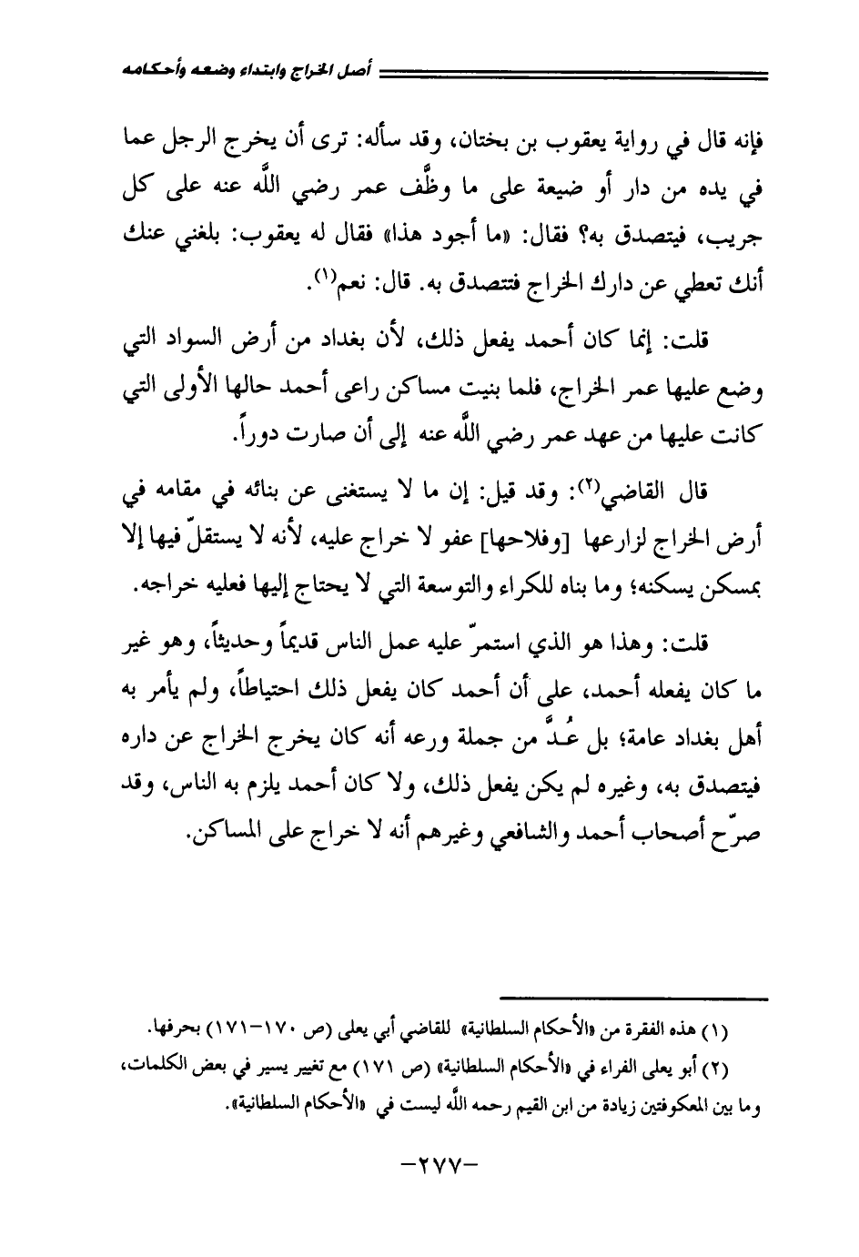 قُلْتُ: وَهَذَا هُوَ الَّذِي اسْتَمَرَّ عَلَيْهِ عَمَلُ النَّاسِ قَدِيمًا وَحَدِيثًا، وَهُوَ غَيْرُ مَا كَانَ يَفْعَلُهُ أَحْمَدُ عَلَى أَنَّ أَحْمَدَ كَانَ يَفْعَلُ ذَلِكَ احْتِيَاطًا وَلَمْ يَأْمُرْ بِهِ أَهْلَ بَغْدَادَ عَامَّةً، بَلْ عَدَّ مِنْ جُمْلَةِ وَرَعِهِ أَنَّهُ كَانَ يُخْرِجُ الْخَرَاجَ عَنْ دَارِهِ فَيَتَصَدَّقُ بِهِ، وَغَيْرُهُ لَمْ يَكُنْ يَفْعَلُ ذَلِكَ وَلَا كَانَ أَحْمَدُ يُلْزِمُ بِهِ النَّاسَ، وَقَدْ صَرَّحَ أَصْحَابُ أَحْمَدَ وَالشَّافِعِيِّ وَغَيْرُهُمْ أَنَّهُ لَا خَرَاجَ عَلَى الْمَسَاكِنِ.