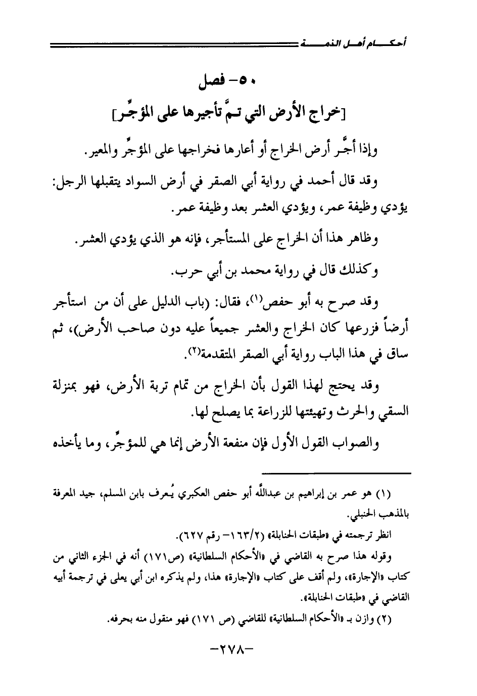 وَقَدْ صَرَّحَ بِهِ أَبُو حَفْصٍ فَقَالَ: بَابُ الدَّلِيلِ عَلَى أَنَّ مَنِ اسْتَأْجَرَ أَرْضًا فَزَرَعَهَا كَانَ الْخَرَاجُ وَالْعُشْرُ جَمِيعًا عَلَيْهِ دُونَ صَاحِبِ الْأَرْضِ، ثُمَّ سَاقَ فِي هَذَا الْبَابِ رِوَايَةَ أَبِي الصَّقْرِ الْمُتَقَدِّمَةَ.