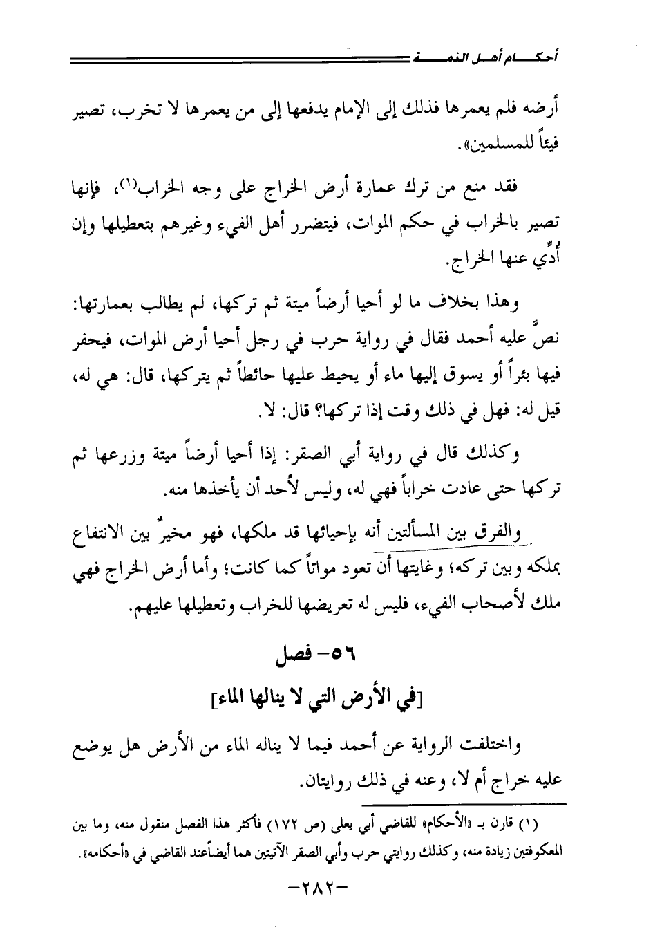 وَاخْتَلَفَتِ الرِّوَايَةُ عَنْ أَحْمَدَ فِيمَا لَا يَنَالُهُ الْمَاءُ مِنَ الْأَرْضِ هَلْ يُوضَعُ عَلَيْهِ خَرَاجٌ أَمْ لَا، وَعَنْهُ فِي ذَلِكَ رِوَايَتَانِ.