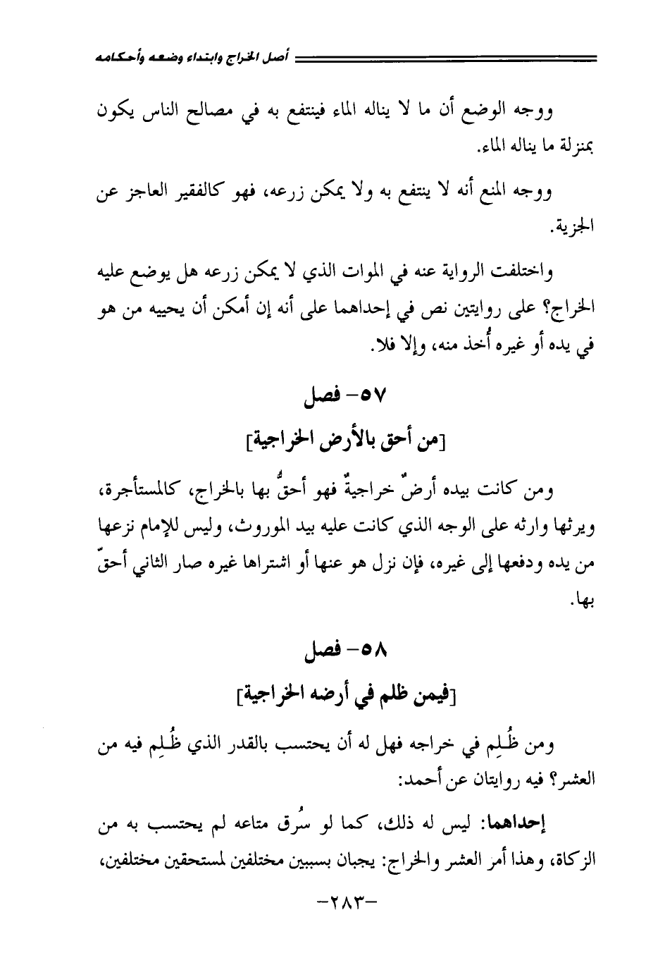 وَمَنْ كَانَتْ بِيَدِهِ أَرْضٌ خَرَاجِيَّةٌ فَهُوَ أَحَقُّ بِهَا بِالْخَرَاجِ كَالْمُسْتَأْجَرَةِ، وَيَرِثُهَا وَارِثُهُ عَلَى الْوَجْهِ الَّذِي كَانَتْ عَلَيْهِ بِيَدِ الْمَوْرُوثِ، وَلَيْسَ لِلْإِمَامِ نَزْعُهَا مِنْ يَدِهِ وَدَفْعُهَا إِلَى غَيْرِهِ، فَإِنْ نَزَلَ هُوَ عَنْهَا أَوِ اشْتَرَاهَا غَيْرُهُ صَارَ الثَّانِي أَحَقَّ بِهَا.