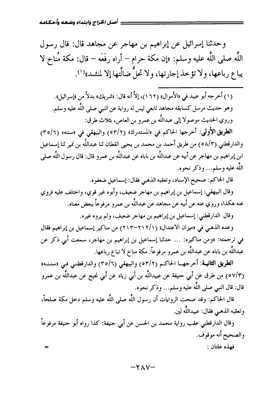 وَحَدَّثَنَا إِسْرَائِيلُ عَنْ إِبْرَاهِيمَ بْنِ مُهَاجِرٍ عَنْ مُجَاهِدٍ قَالَ: قَالَ رَسُولُ اللَّهِ - صَلَّى اللَّهُ عَلَيْهِ وَسَلَّمَ -: " «إِنَّ مَكَّةَ حَرَامٌ - أَرَاهُ رَفَعَهُ - قَالَ: مَكَّةُ مُنَاخٌ لَا يُبَاعُ رِبَاعُهَا، وَلَا تُؤْخَذُ إِجَارَتُهَا، وَلَا تَحِلُّ ضَالَّتُهَا إِلَّا لِمُنْشِدٍ» ".