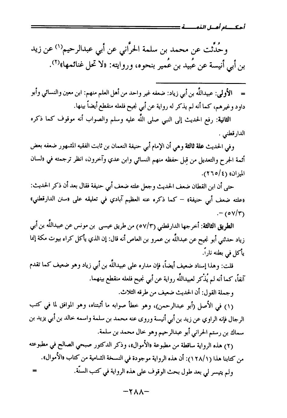 وَحُدِّثْتُ عَنْ مُحَمَّدِ بْنِ سَلَمَةَ الْحَرَّانِيِّ عَنْ أَبِي عَبْدِ الرَّحِيمِ عَنْ زَيْدِ بْنِ أَبِي أُنَيْسَةَ عَنْ عُبَيْدِ بْنِ عُمَيْرٍ بِنَحْوِهِ، وَرِوَايَتُهُ: " «لَا تَحِلُّ غَنَائِمُهَا» ".