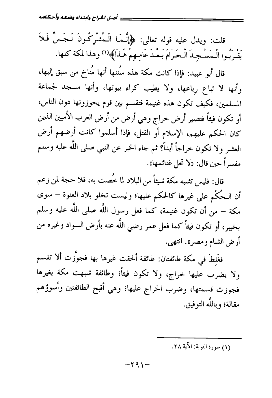 قَالَ أَبُو عُبَيْدٍ: فَإِذَا كَانَتْ مَكَّةُ هَذِهِ سُنَنُهَا أَنَّهَا مُنَاخُ مَنْ سَبَقَ إِلَيْهَا، وَأَنَّهَا لَا تُبَاعُ رِبَاعُهَا وَلَا يَطِيبُ كِرَاءُ بُيُوتِهَا، وَأَنَّهَا مَسْجِدٌ لِجَمَاعَةِ الْمُسْلِمِينَ، فَكَيْفَ تَكُونُ هَذِهِ غَنِيمَةً فَتُقَسَّمُ بَيْنَ قَوْمٍ يَحُوزُونَهَا دُونَ النَّاسِ، أَوْ تَكُونُ فَيْئًا فَتَصِيرُ أَرْضَ خَرَاجٍ وَهِيَ أَرْضٌ مِنْ أَرْضِ الْعَرَبِ الْأُمِّيِّينَ الَّذِينَ كَانَ الْحُكْمُ عَلَيْهِمُ الْإِسْلَامَ أَوِ الْقَتْلَ فَإِذَا أَسْلَمُوا كَانَتْ أَرْضُهُمْ أَرْضَ الْعُشْرِ وَلَا تَكُونُ خَرَاجًا أَبَدًا؟ ثُمَّ جَاءَ الْخَبَرُ عَنِ النَّبِيِّ - صَلَّى اللَّهُ عَلَيْهِ وَسَلَّمَ - مُفَسِّرًا حِينَ قَالَ: " «لَا تَحِلُّ غَنَائِمُهَا» ".