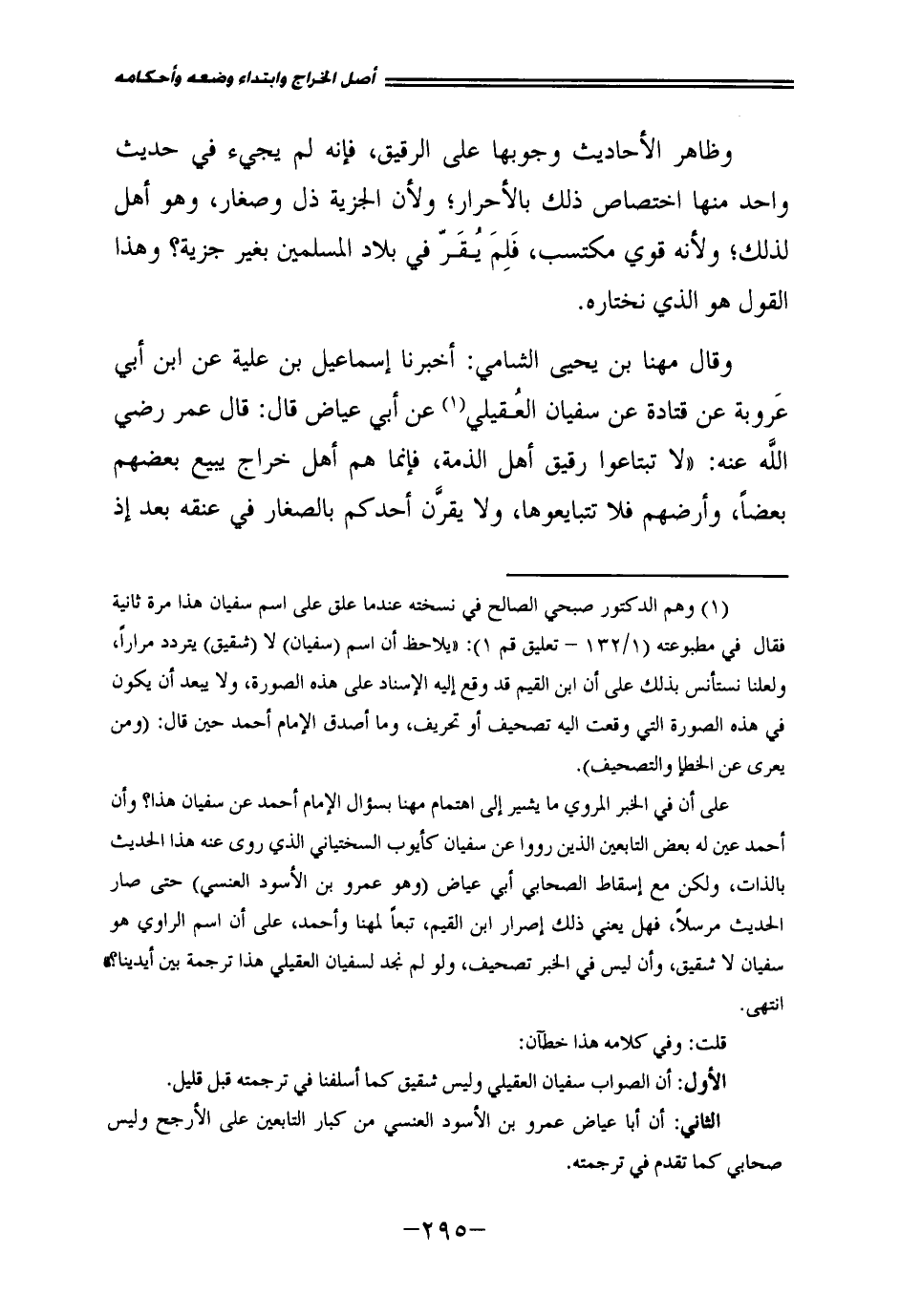 وَقَالَ مُهَنَّا بْنُ يَحْيَى الشَّامِيُّ: أَخْبَرَنَا إِسْمَاعِيلُ ابْنُ عُلَيَّةَ عَنِ ابْنِ أَبِي عَرُوبَةَ عَنْ قَتَادَةَ عَنْ سُفْيَانَ الْعُقَيْلِيِّ عَنْ أَبِي عِيَاضٍ قَالَ قَالَ: عُمَرُ رَضِيَ اللَّهُ عَنْهُ: " لَا تَبْتَاعُوا رَقِيقَ أَهْلِ الذِّمَّةِ، فَإِنَّمَا هُمْ أَهْلُ خَرَاجٍ يَبِيعُ بَعْضُهُمْ بَعْضًا، وَأَرْضُهُمْ فَلَا تَتَبَايَعُوهَا، وَلَا يُقِرَّنَّ أَحَدُكُمْ بِالصَّغَارِ فِي عُنُقِهِ بَعْدَ إِذْ