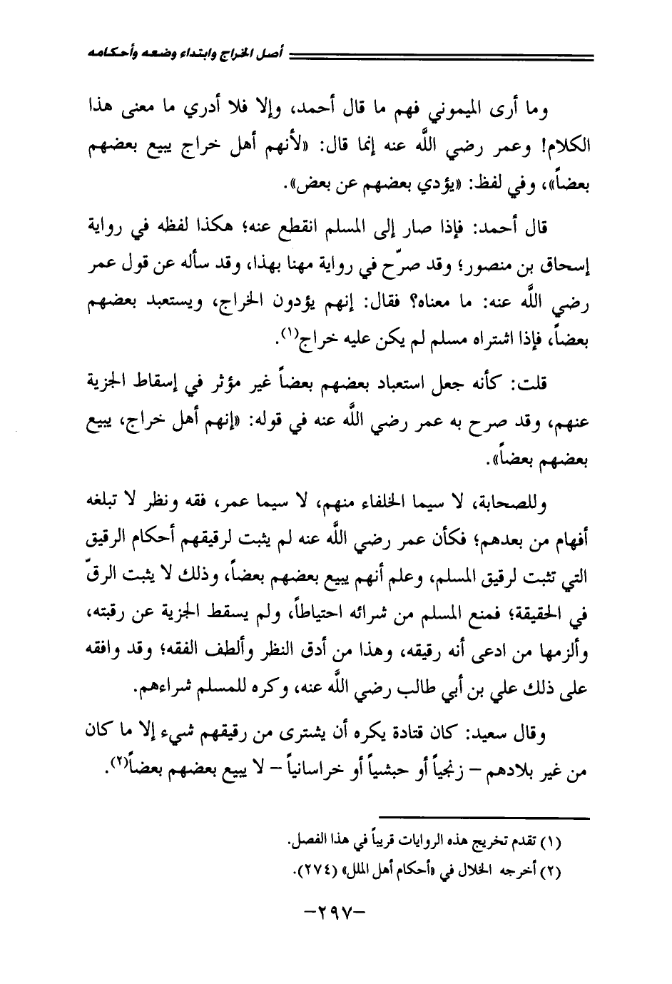 قَالَ أَحْمَدُ: فَإِذَا صَارَ إِلَى الْمُسْلِمِ انْقَطَعَ عَنْهُ، هَكَذَا لَفْظُهُ فِي رِوَايَةِ إِسْحَاقَ بْنِ مَنْصُورٍ، وَقَدْ صَرَّحَ فِي رِوَايَةِ مُهَنَّا بِهَذَا، وَقَدْ سَأَلَهُ عَنْ قَوْلِ عُمَرَ رَضِيَ اللَّهُ عَنْهُ: مَا مَعْنَاهُ؟ فَقَالَ: إِنَّهُمْ يُؤَدُّونَ الْخَرَاجَ وَيَسْتَعْبِدُ بَعْضُهُمْ بَعْضًا فَإِذَا اشْتَرَاهُ مُسْلِمٌ لَمْ يَكُنْ عَلَيْهِ خَرَاجٌ.