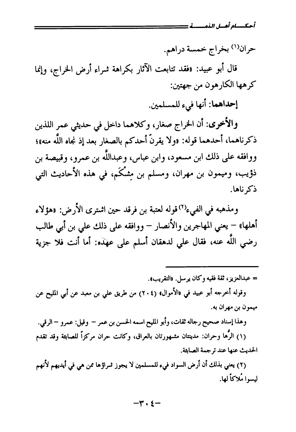 قَالَ أَبُو عُبَيْدٍ: فَقَدْ تَتَابَعَتِ الْآثَارُ بِكَرَاهَةِ شِرَاءِ أَرْضِ الْخَرَاجِ، وَإِنَّمَا كَرِهَهَا الْكَارِهُونَ مِنْ جِهَتَيْنِ.