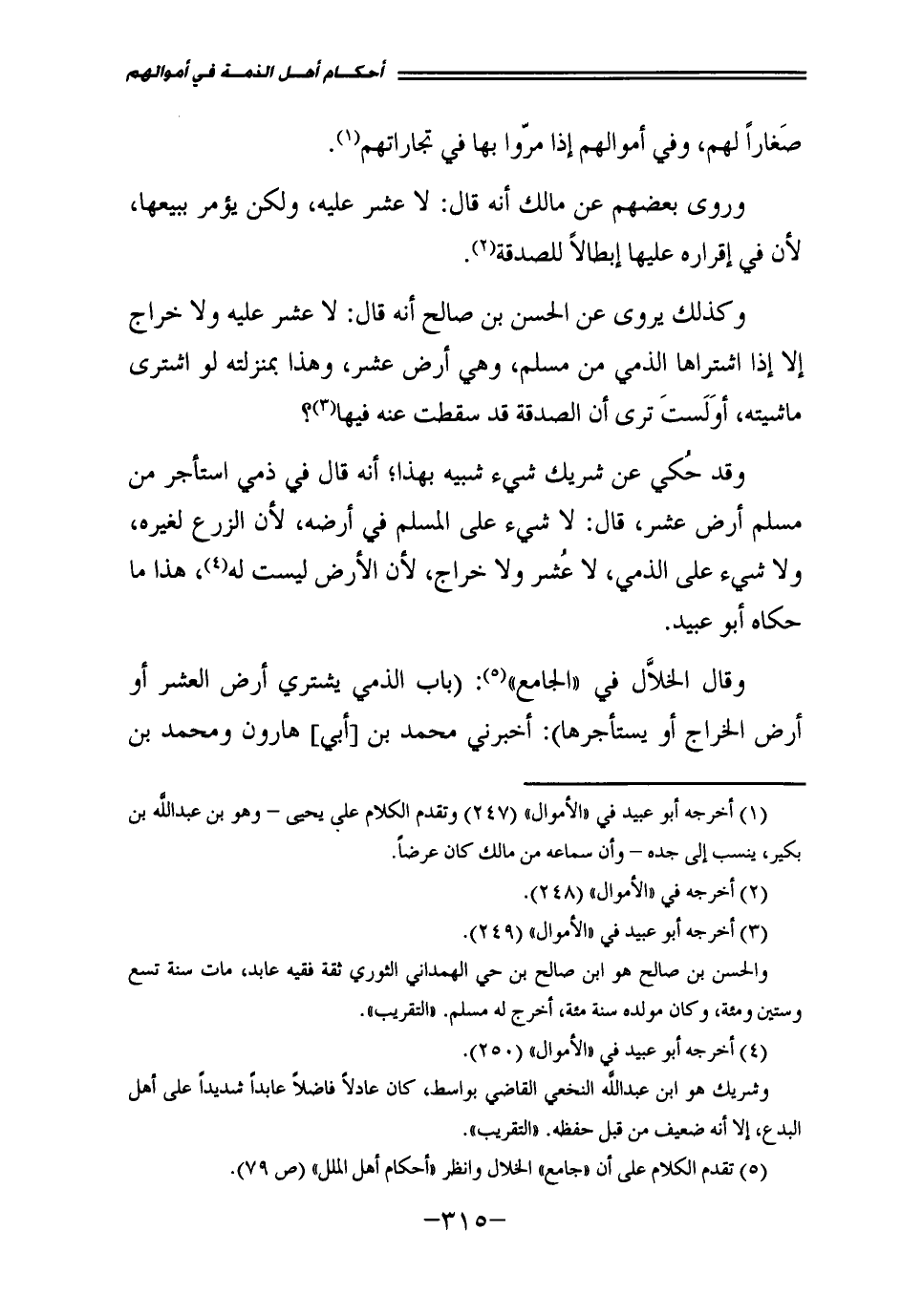 وَكَذَلِكَ يُرْوَى عَنِ الْحَسَنِ بْنِ صَالِحٍ أَنَّهُ قَالَ: لَا عُشْرَ عَلَيْهِ وَلَا خَرَاجَ إِلَّا إِذَا اشْتَرَاهَا الذِّمِّيُّ مِنْ مُسْلِمٍ، وَهِيَ أَرْضُ عُشْرٍ وَهَذَا بِمَنْزِلَتِهِ لَوِ اشْتَرَى مَاشِيَتَهُ أَوَلَسْتَ تَرَى أَنَّ الصَّدَقَةَ قَدْ سَقَطَتْ عَنْهُ فِيهَا؟ .