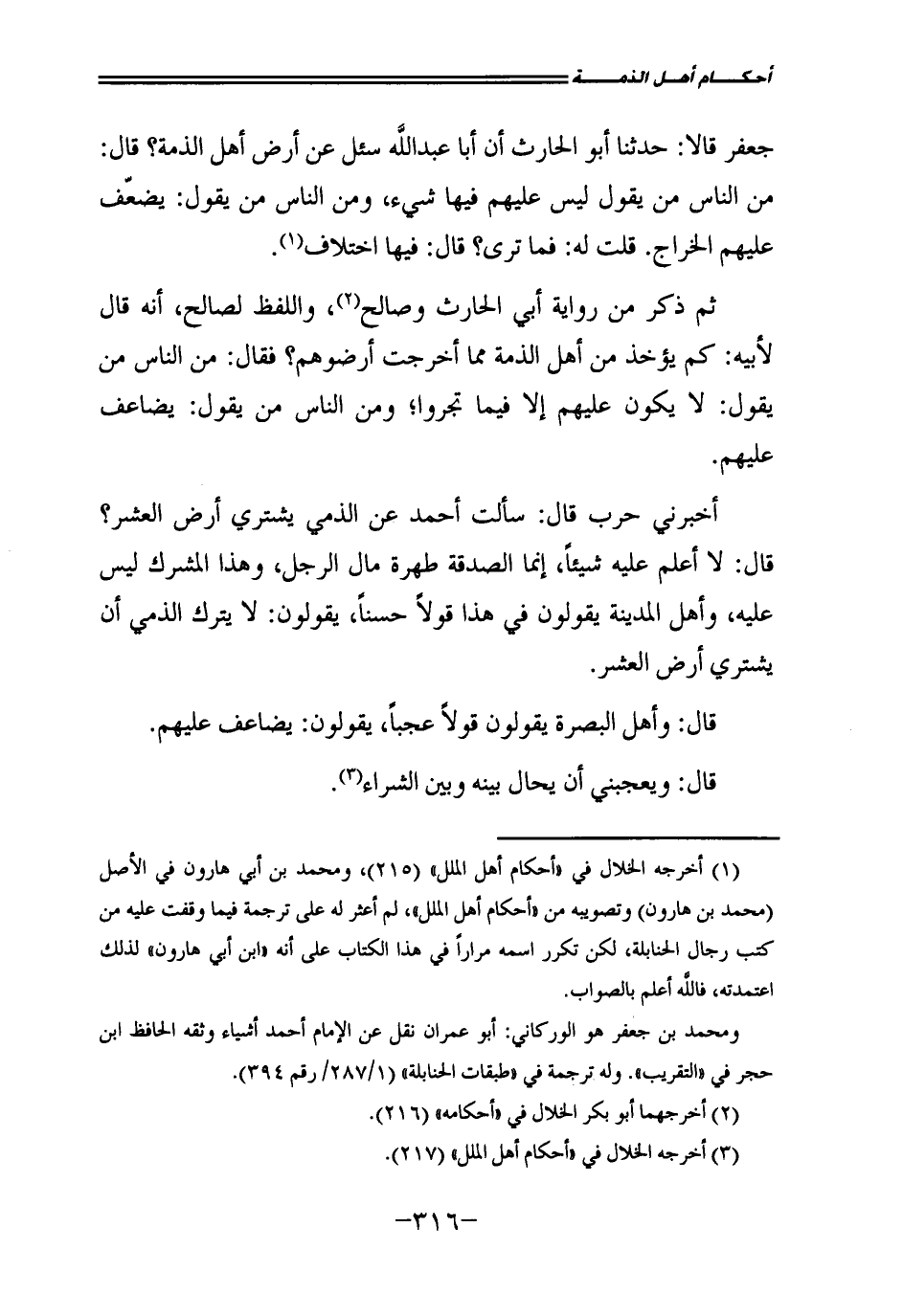 ثُمَّ ذَكَرَ مِنْ رِوَايَةِ أَبِي الْحَارِثِ وَصَالِحٍ وَاللَّفْظُ لِصَالِحٍ أَنَّهُ قَالَ لِأَبِيهِ: كَمْ يُؤْخَذُ مِنْ أَهْلِ الذِّمَّةِ مِمَّا أَخْرَجَتْ أَرَضُوهُمْ؟ فَقَالَ: مِنَ النَّاسِ مَنْ يَقُولُ: لَا يَكُونُ عَلَيْهِمْ إِلَّا فِيمَا تَجِرُوا، وَمِنَ النَّاسِ مَنْ يَقُولُ: يُضَاعَفُ عَلَيْهِمْ.