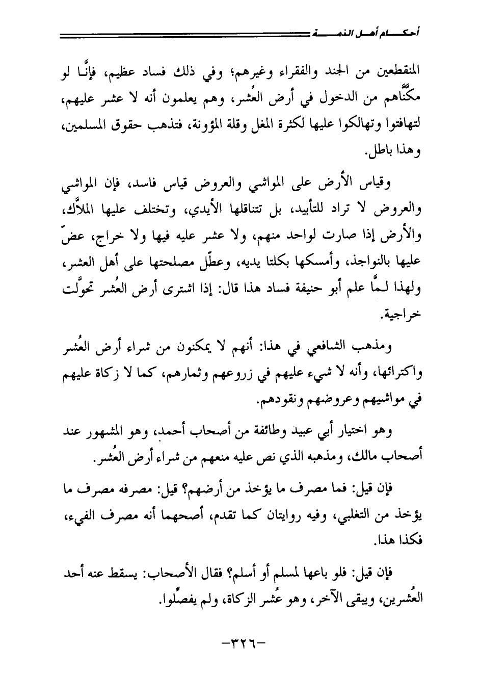 الْمُنْقَطِعِينَ مِنَ الْجُنْدِ وَالْفُقَرَاءِ وَغَيْرِهِمْ، وَفِي ذَلِكَ فَسَادٌ عَظِيمٌ، فَإِنَّا لَوْ مَكَّنَّاهُمْ مِنَ الدُّخُولِ فِي أَرْضِ الْعُشْرِ وَهُمْ يَعْلَمُونَ أَنَّهُ لَا عُشْرَ عَلَيْهِمْ لَتَهَافَتُوا وَتَهَالَكُوا عَلَيْهَا لِكَثْرَةِ الْمُغَلِّ وَقِلَّةِ الْمَئُونَةِ فَتَذْهَبُ حُقُوقُ الْمُسْلِمِينَ وَهَذَا بَاطِلٌ.