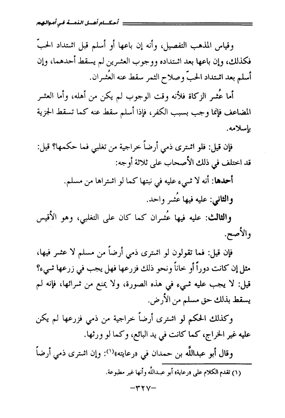 وَقَالَ أَبُو عَبْدِ اللَّهِ بْنُ حَمْدَانَ فِي " رِعَايَتِهِ ": وَإِنِ اشْتَرَى ذِمِّيٌّ أَرْضًا