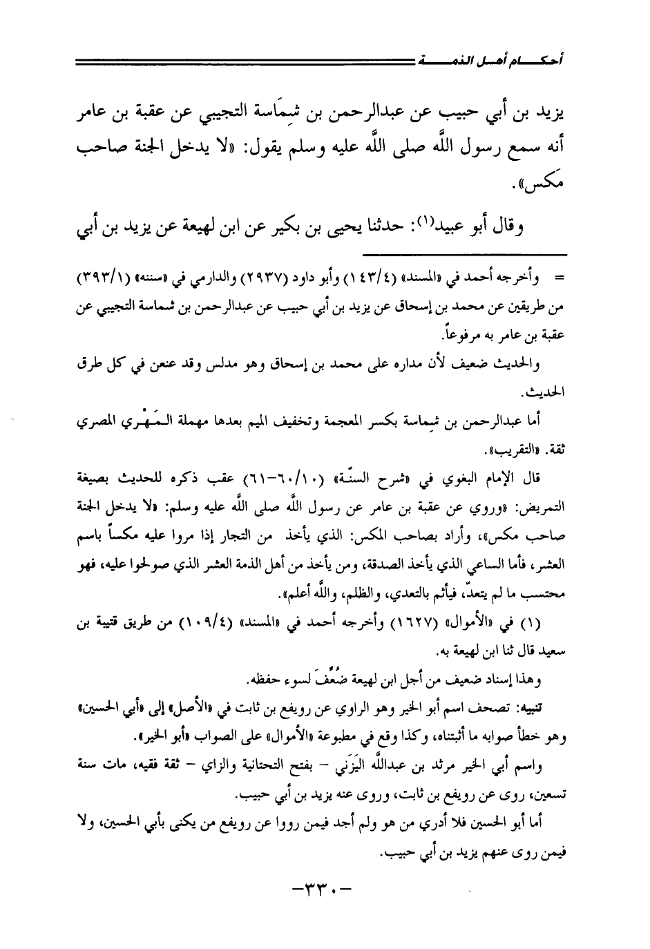يَزِيدَ بْنِ أَبِي حَبِيبٍ عَنْ عَبْدِ الرَّحْمَنِ بْنِ شِمَاسَةَ التُّجِيبِيِّ عَنْ عُقْبَةَ بْنِ عَامِرٍ أَنَّهُ سَمِعَ رَسُولَ اللَّهِ - صَلَّى اللَّهُ عَلَيْهِ وَسَلَّمَ - يَقُولُ: " «لَا يَدْخُلُ الْجَنَّةَ صَاحِبُ مَكْسٍ» ".
