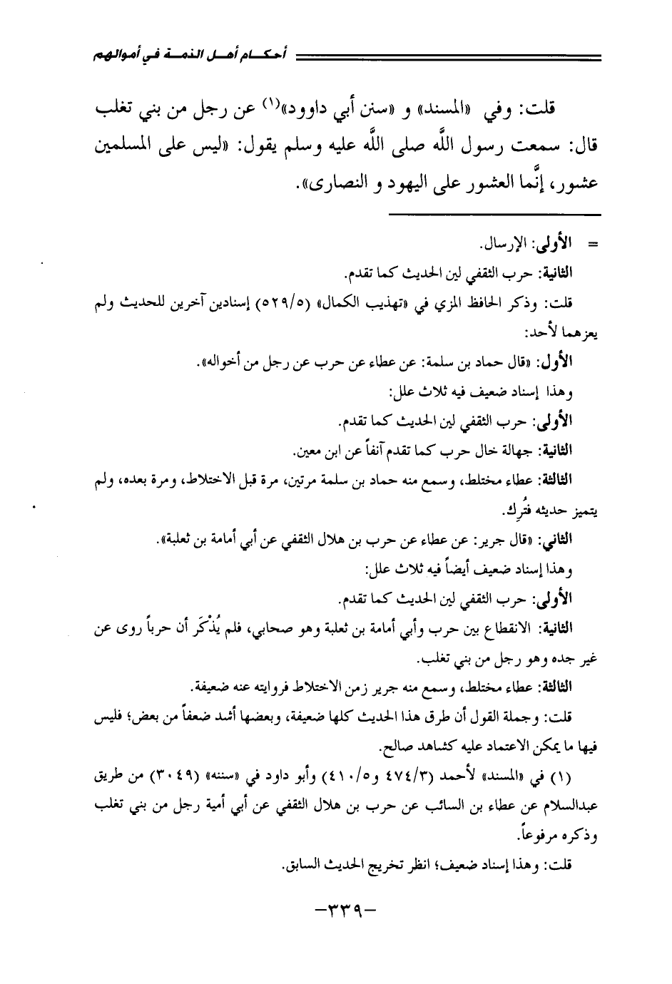 قُلْتُ: وَفِي " الْمُسْنَدِ " وَ " سُنَنِ أَبِي دَاوُدَ " عَنْ رَجُلٍ مِنْ بَنِي تَغْلِبَ قَالَ: سَمِعْتُ رَسُولَ اللَّهِ - صَلَّى اللَّهُ عَلَيْهِ وَسَلَّمَ - يَقُولُ: " «لَيْسَ عَلَى الْمُسْلِمِينَ عُشُورٌ، إِنَّمَا الْعُشُورُ عَلَى الْيَهُودِ وَالنَّصَارَى» ".