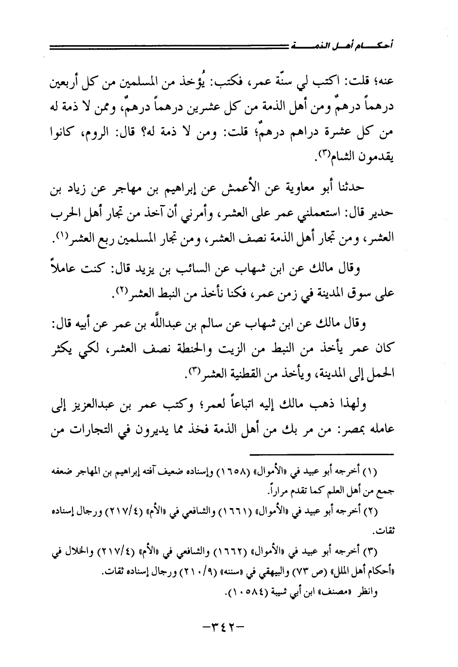 عَنْهُ قُلْتُ: اكْتُبْ لِي سُنَّةَ عُمَرَ فَكَتَبَ: يُؤْخَذُ مِنَ الْمُسْلِمِينَ مِنْ كُلِّ أَرْبَعِينَ دِرْهَمًا دِرْهَمٌ وَمِنْ أَهْلِ الذِّمَّةِ مِنْ كُلِّ عِشْرِينَ دِرْهَمًا دِرْهَمٌ، وَمِمَّنْ لَا ذِمَّةَ لَهُ مِنْ كُلِّ عَشَرَةِ دَرَاهِمَ دِرْهَمٌ، قُلْتُ: وَمَنْ لَا ذِمَّةَ لَهُ؟ قَالَ: الرُّومُ، كَانُوا يَقْدَمُونَ الشَّامَ.