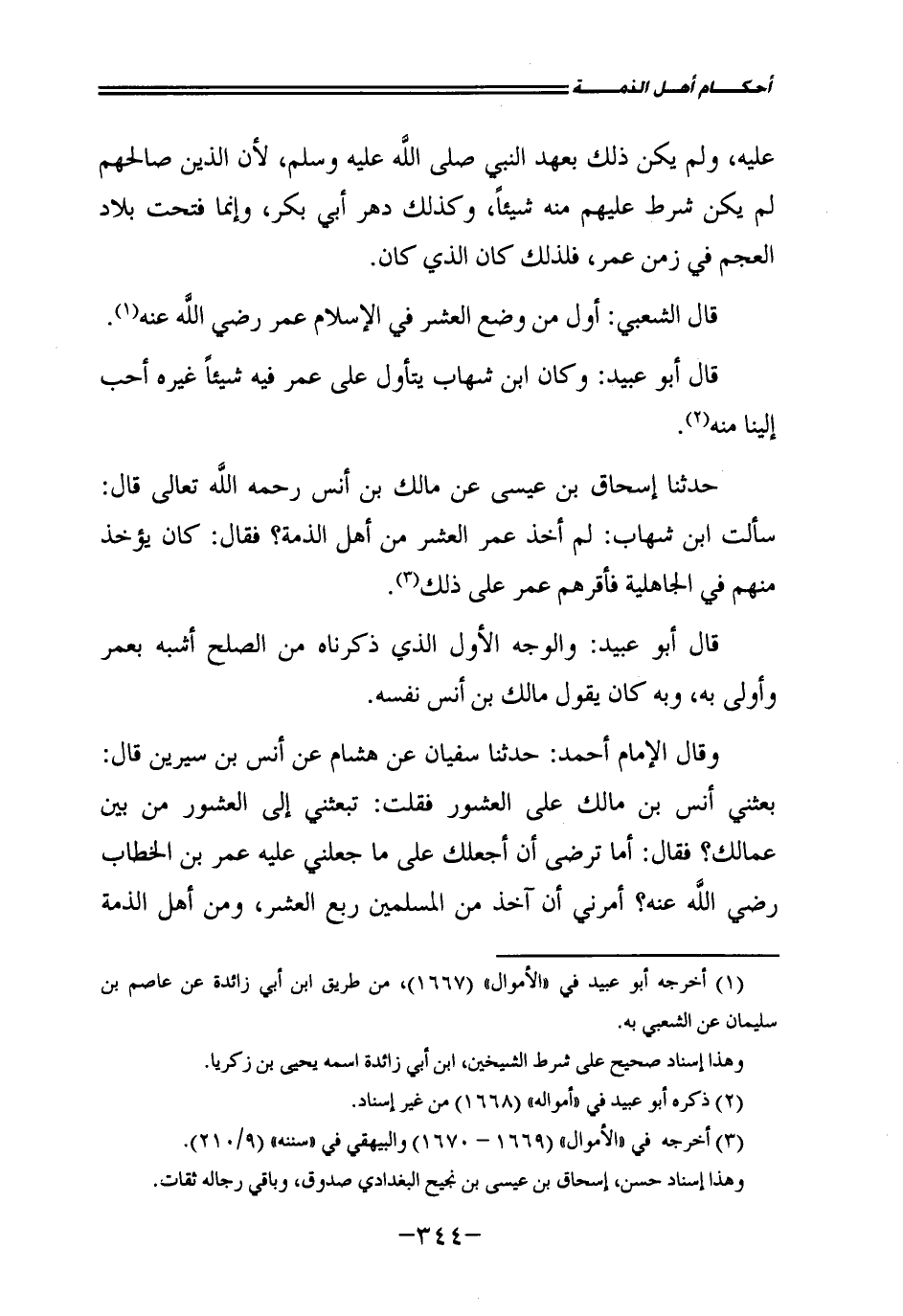 حَدَّثَنَا إِسْحَاقُ بْنُ عِيسَى عَنْ مَالِكِ بْنِ أَنَسٍ رَحِمَهُ اللَّهُ تَعَالَى قَالَ: سَأَلْتُ ابْنَ شِهَابٍ لِمَ أَخَذَ عُمَرُ الْعُشْرَ مِنْ أَهْلِ الذِّمَّةِ؟ فَقَالَ: كَانَ يُؤْخَذُ مِنْهُمْ فِي الْجَاهِلِيَّةِ فَأَقَرَّهُمْ عُمَرُ عَلَى ذَلِكَ.