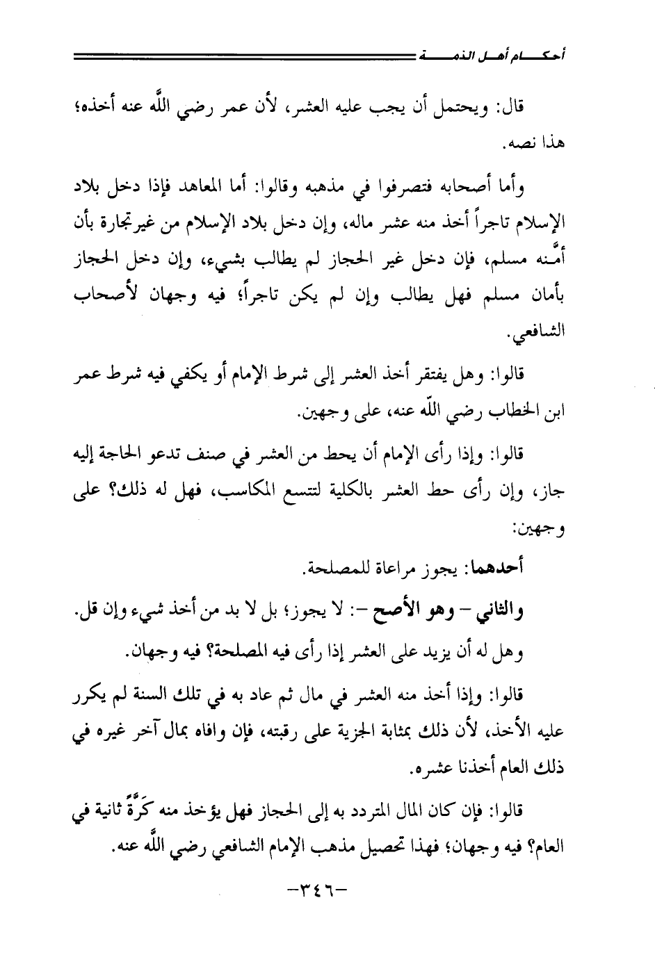 قَالُوا: فَإِنْ كَانَ الْمَالُ الْمُتَرَدَّدَ بِهِ إِلَى الْحِجَازِ فَهَلْ يُؤْخَذُ مِنْهُ كَرَّةً ثَانِيَةً فِي الْعَامِ؟ فِيهِ وَجْهَانِ فَهَذَا تَحْصِيلُ مَذْهَبِ الْإِمَامِ الشَّافِعِيِّ رَضِيَ اللَّهُ عَنْهُ.